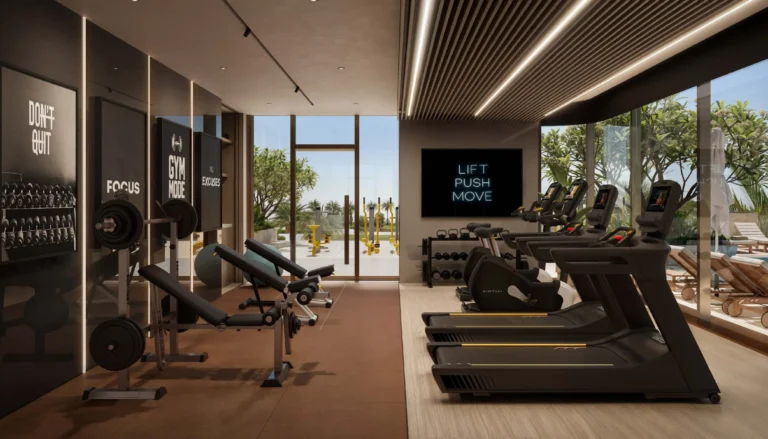 Flora Shore’s elevated pool deck houses a main pool, kids’ pool, open-air gym, and yoga retreat, blending fitness with leisure in a peaceful coastal oasis.
