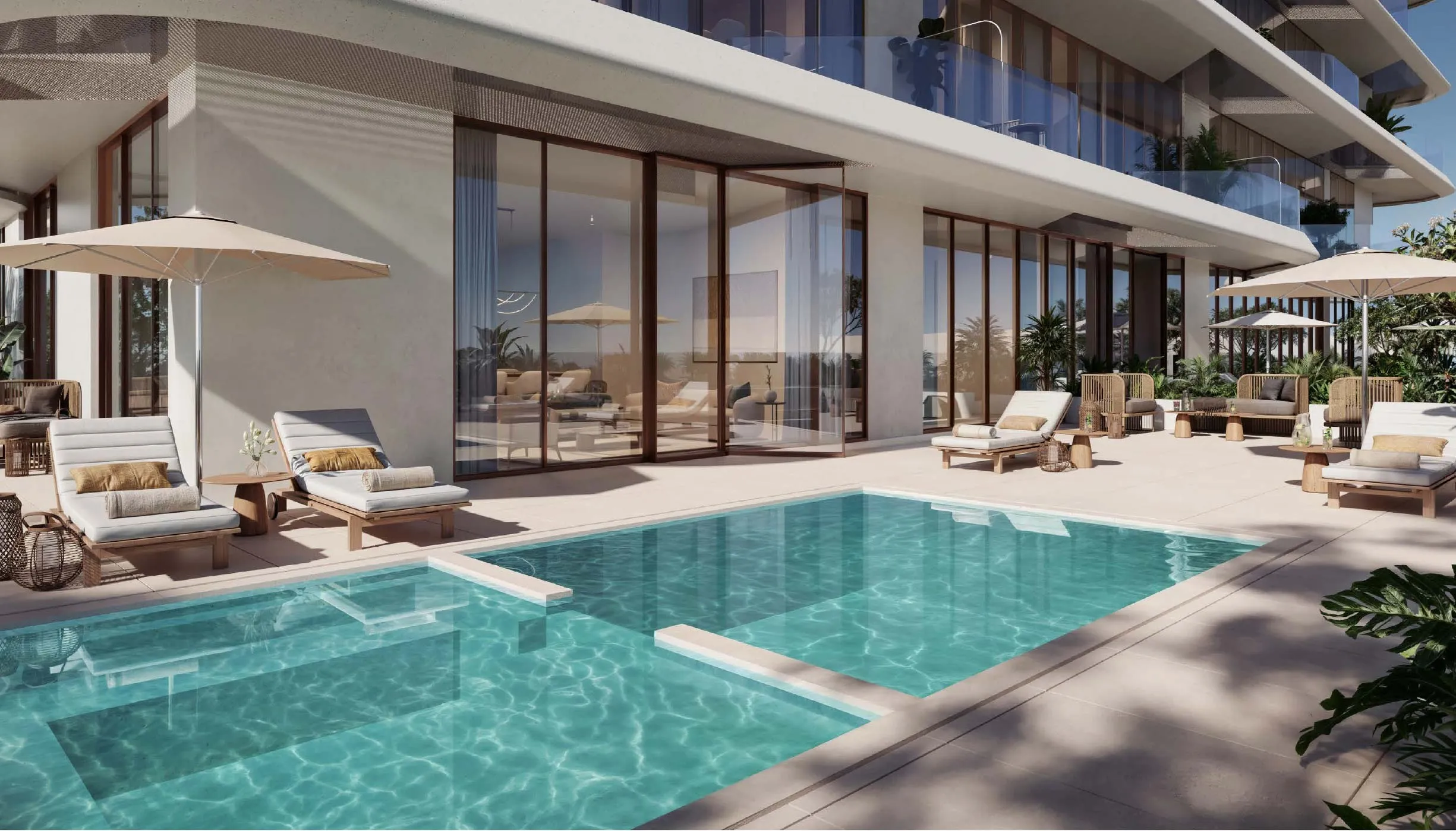 The project offers 2, 3, and 4-bedroom fully furnished residences, some featuring private pools. Each apartment combines elegant coastal interiors with spacious layouts and private outdoor spaces.