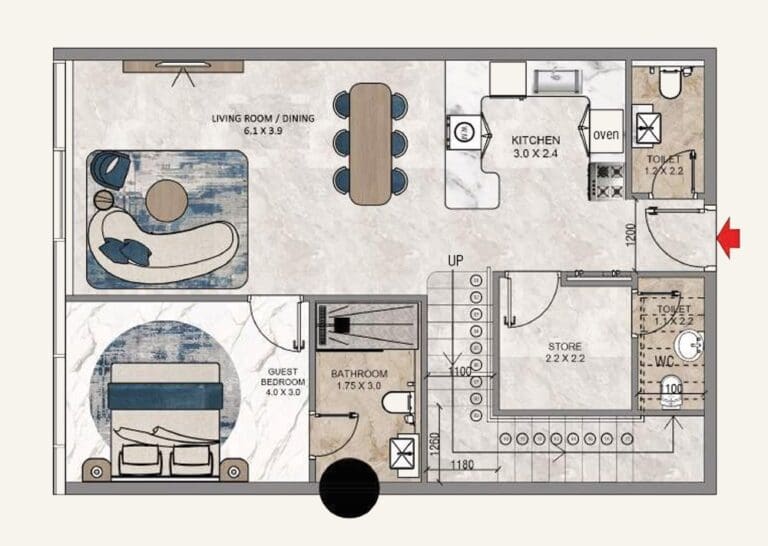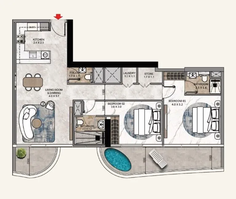 From a product standpoint, the focus is on quality and finish. Apartments feature marble-effect flooring, natural wood details, and custom joinery, while shared amenities include a TechnoGym fitness center, a podium-level clubhouse, and a rooftop infinity pool with jacuzzi.