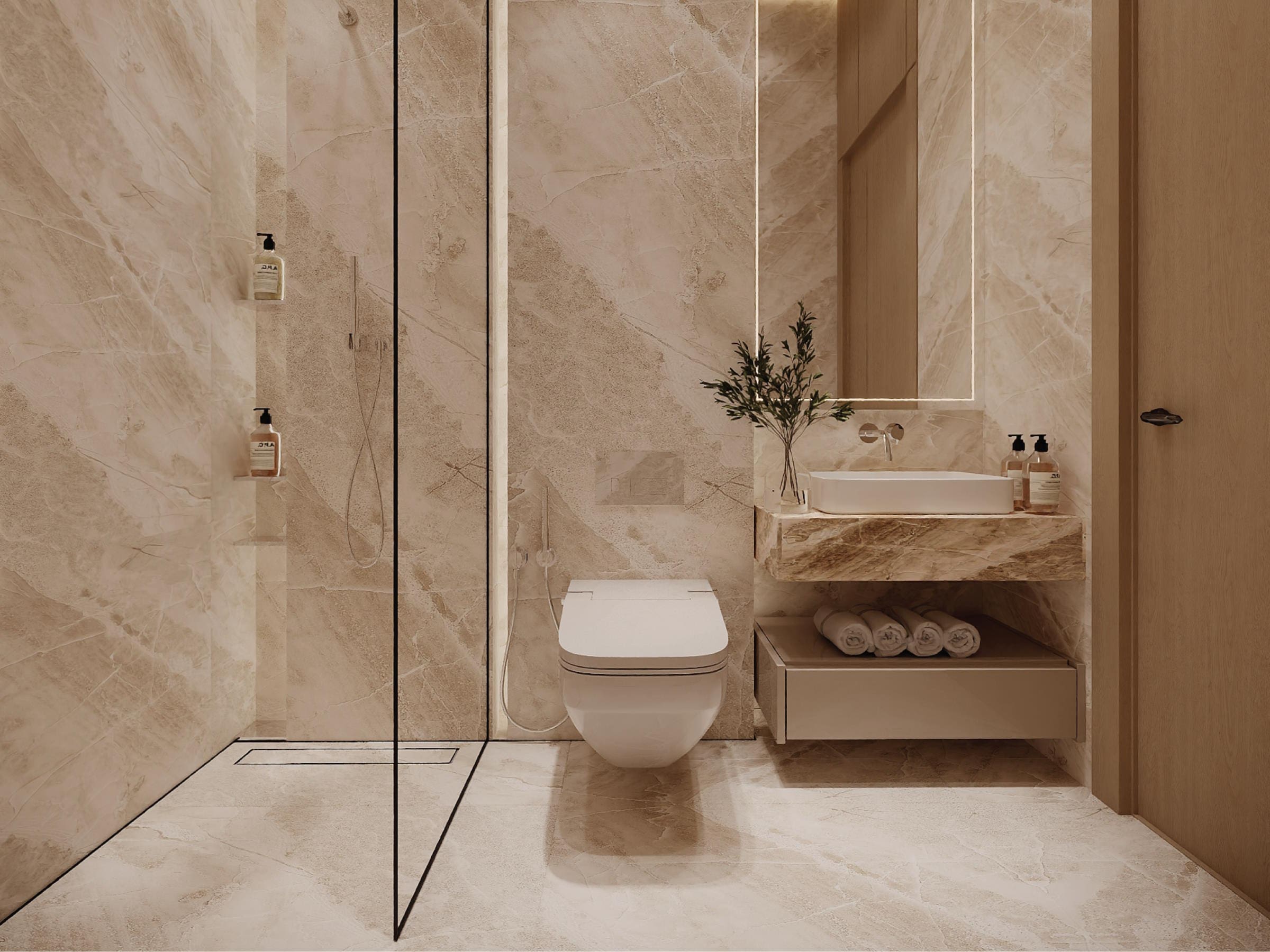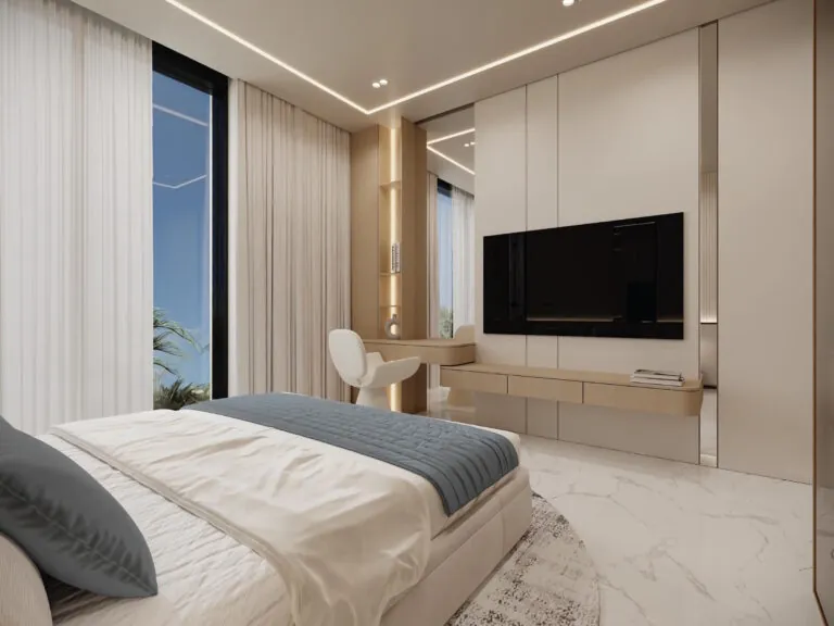 The project offers 64 luxury residences in total, including 1–4 bedroom apartments and four duplex residences. All units are delivered fully furnished and feature high-end interior finishes in light, natural palettes, including marble-effect porcelain tile flooring, light wood detailing, custom joinery, smart lighting, ambient ceilings, integrated mirrors, and floor-to-ceiling windows with sea views. Selected residences include private pools.