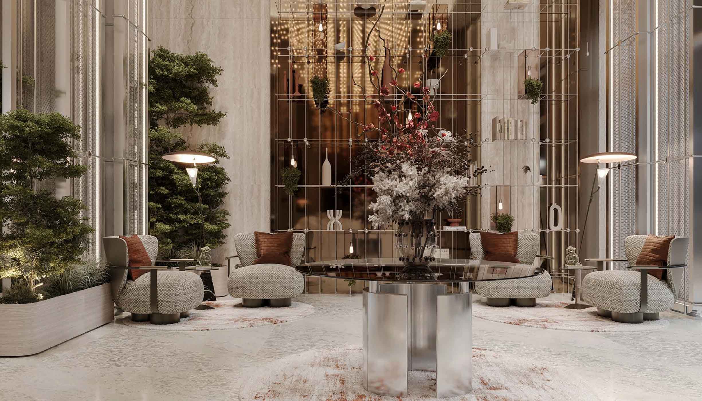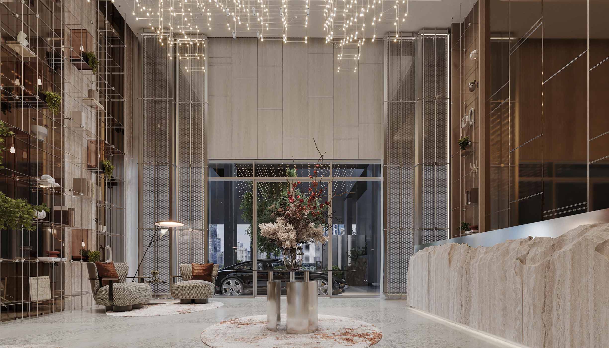 The project features a building configuration of G+2P+14+R, offering 1BR, 2BR, 3BR, and 4BR duplex apartments with sizes starting from 730 sq.ft. The residences are fully furnished, accessorized by Hermès, and equipped with Miele and Villeroy & Boch appliances. Architecture includes stepped terraces and floor-to-ceiling windows.