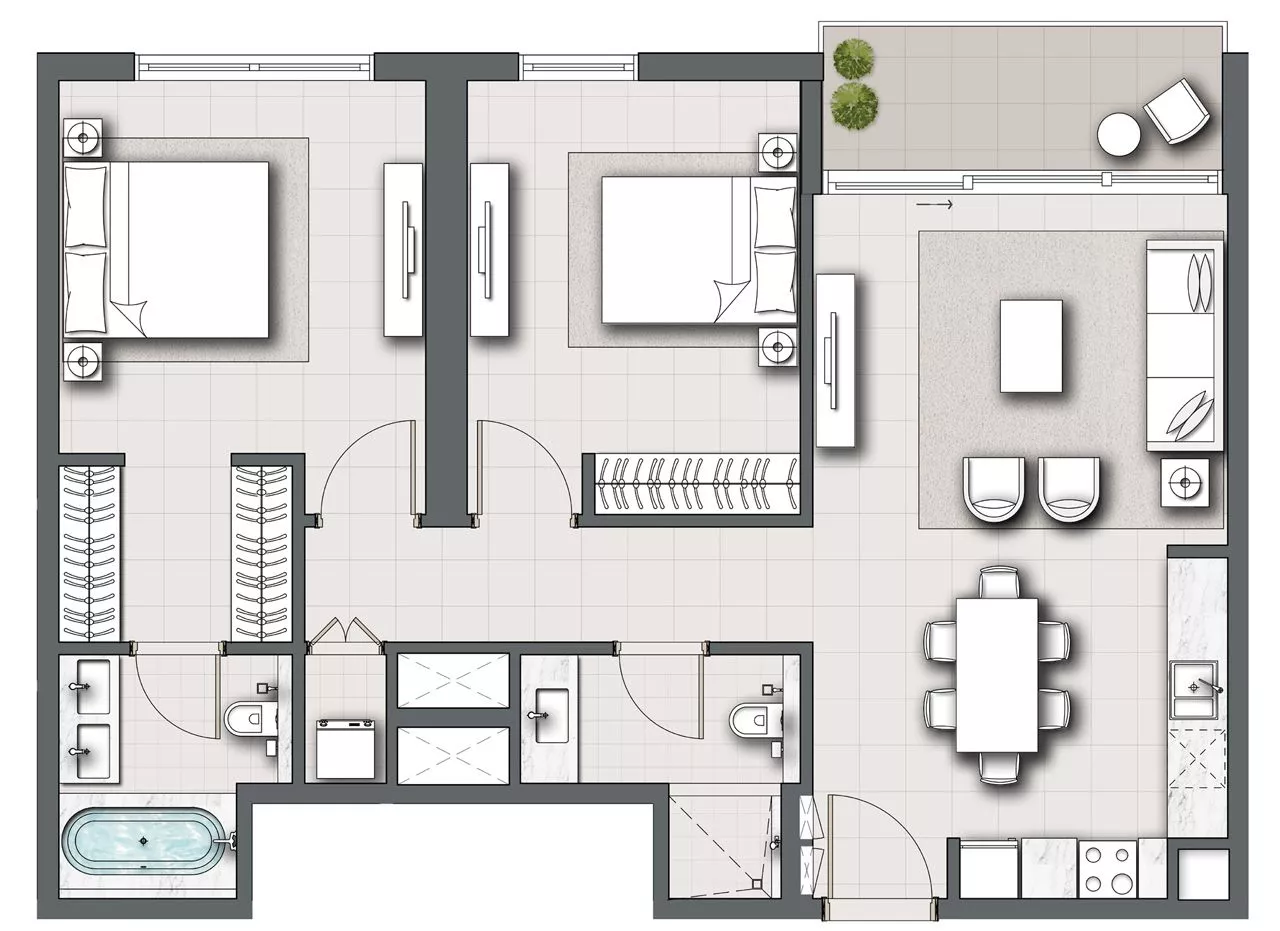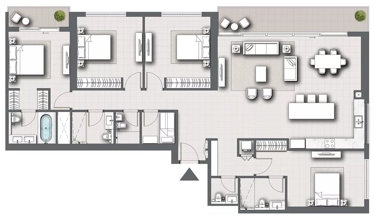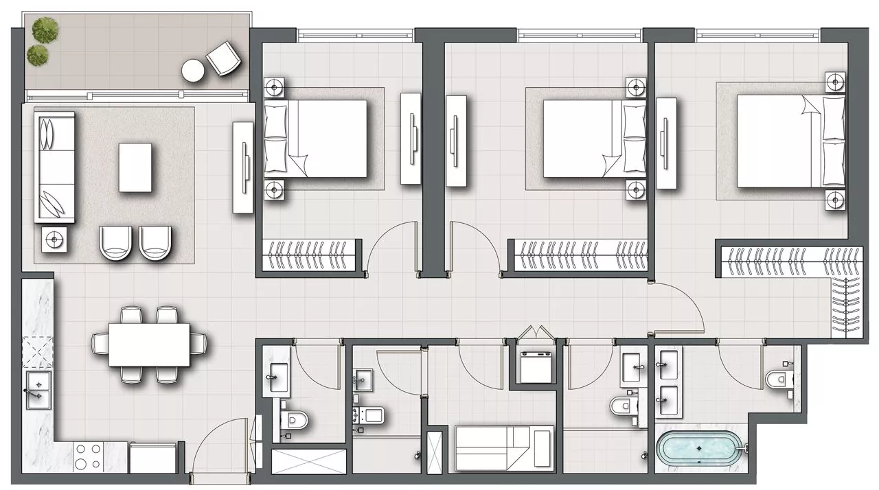All apartments will boast 1 or more balconies and a laundry room, while 3-4 bedroom residences will also feature a maid’s room with an ensuite bathroom for the maximum comfort and convenience of homeowners. At the same time, occupants of the 5-bedroom penthouse will have a study, a private pool and a deck, among other amenities, at their full disposal.