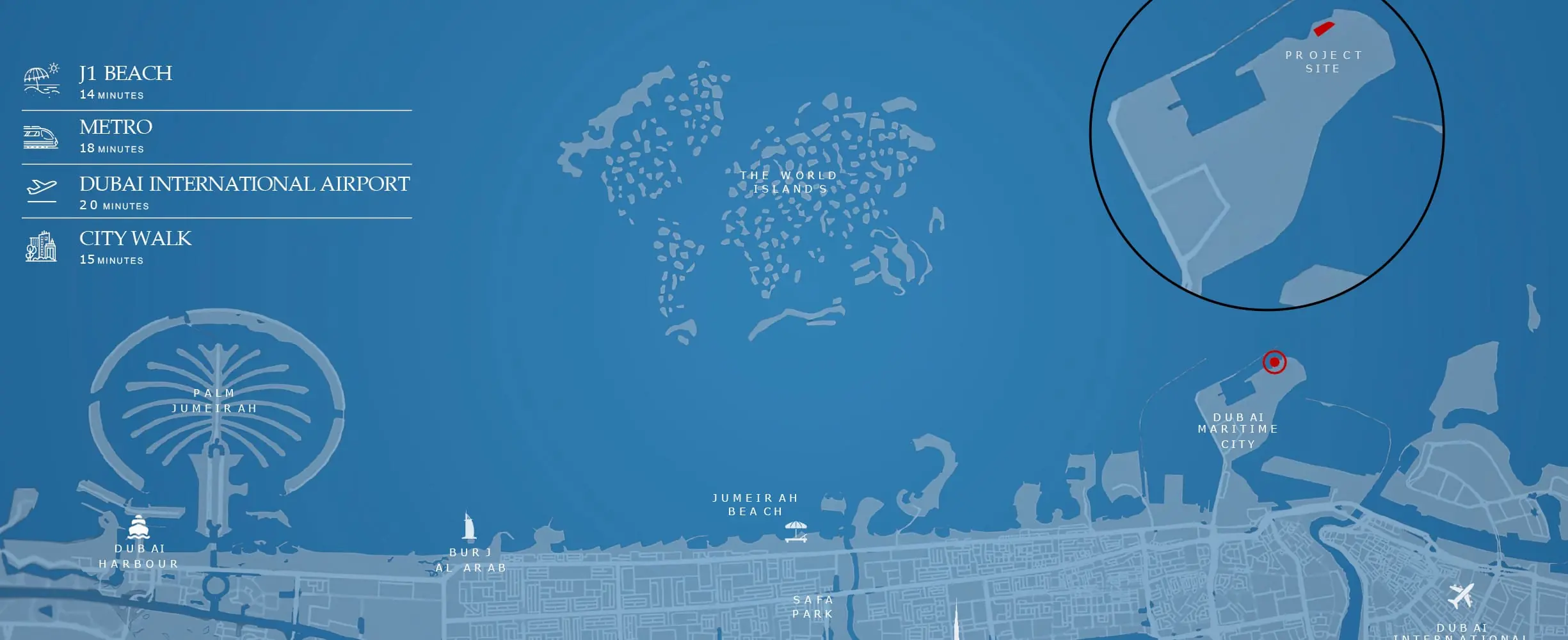 The project is located in Dubai Maritime City, just south of Dubai Islands.
