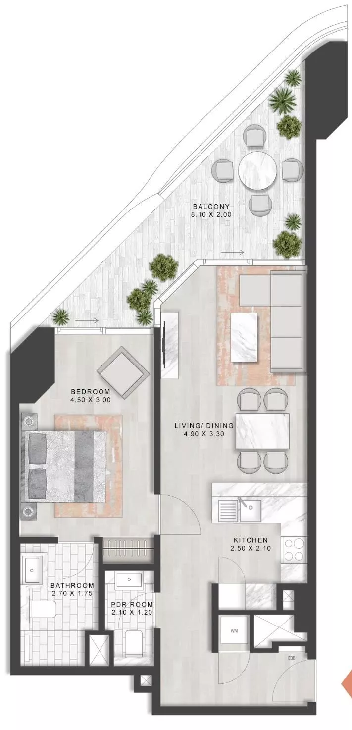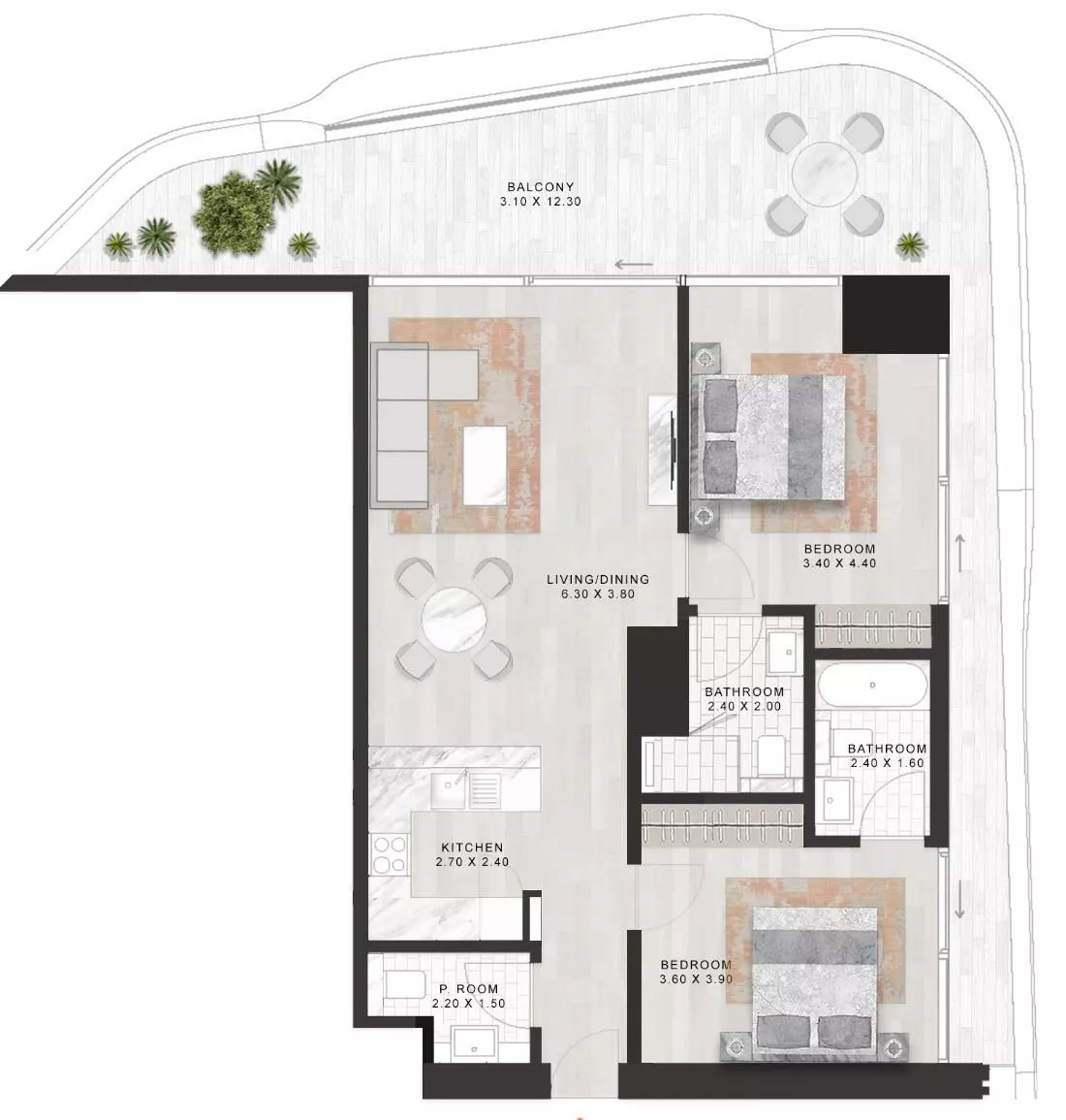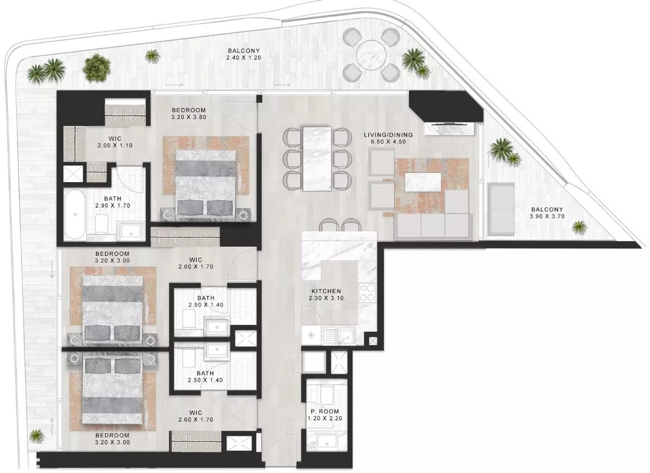 The size of the properties ranges from 776 sq. ft to 1,815 sq. ft. You will be able to enjoy wonderful views of the Arabian Gulf and tropical gardens from your balcony.