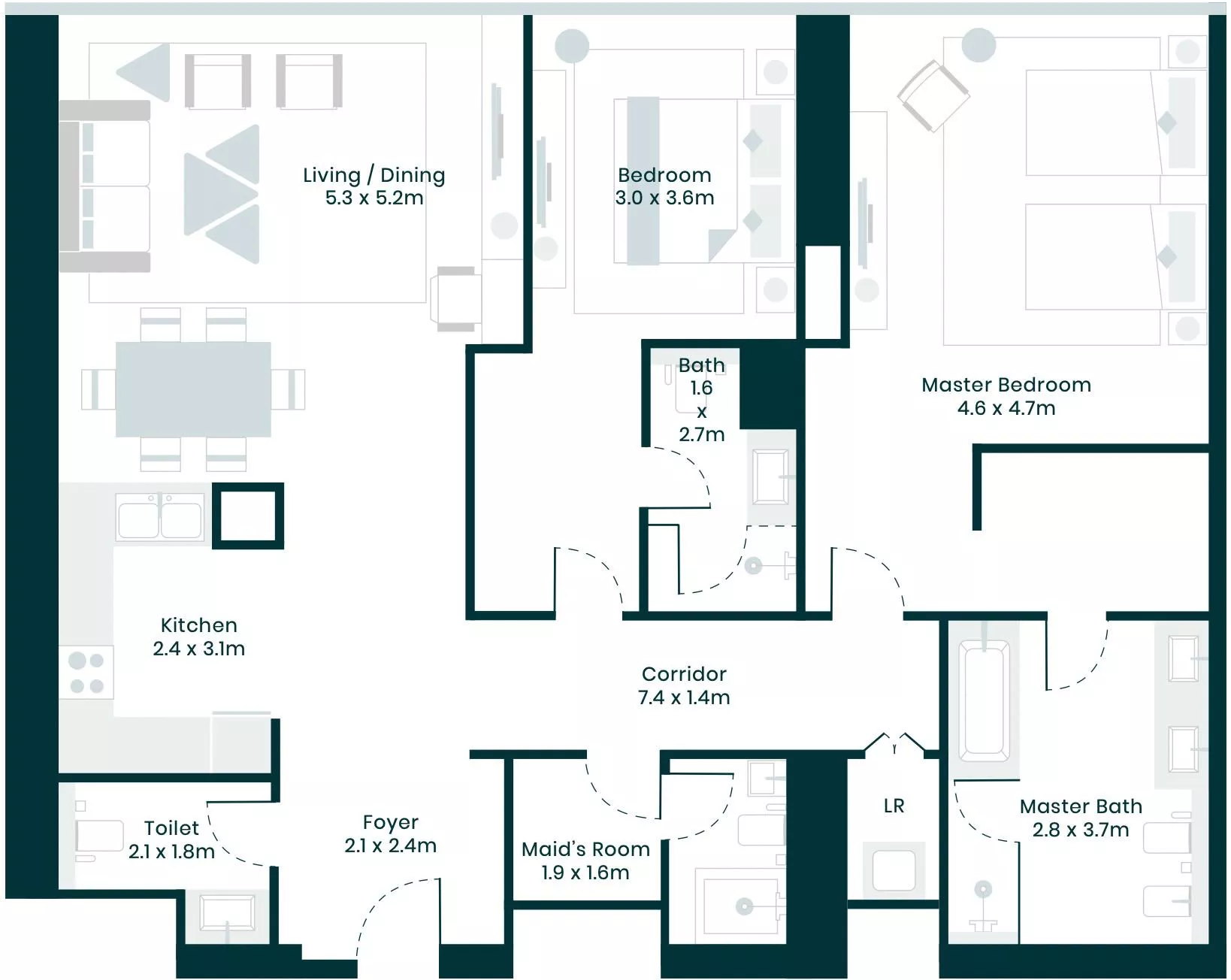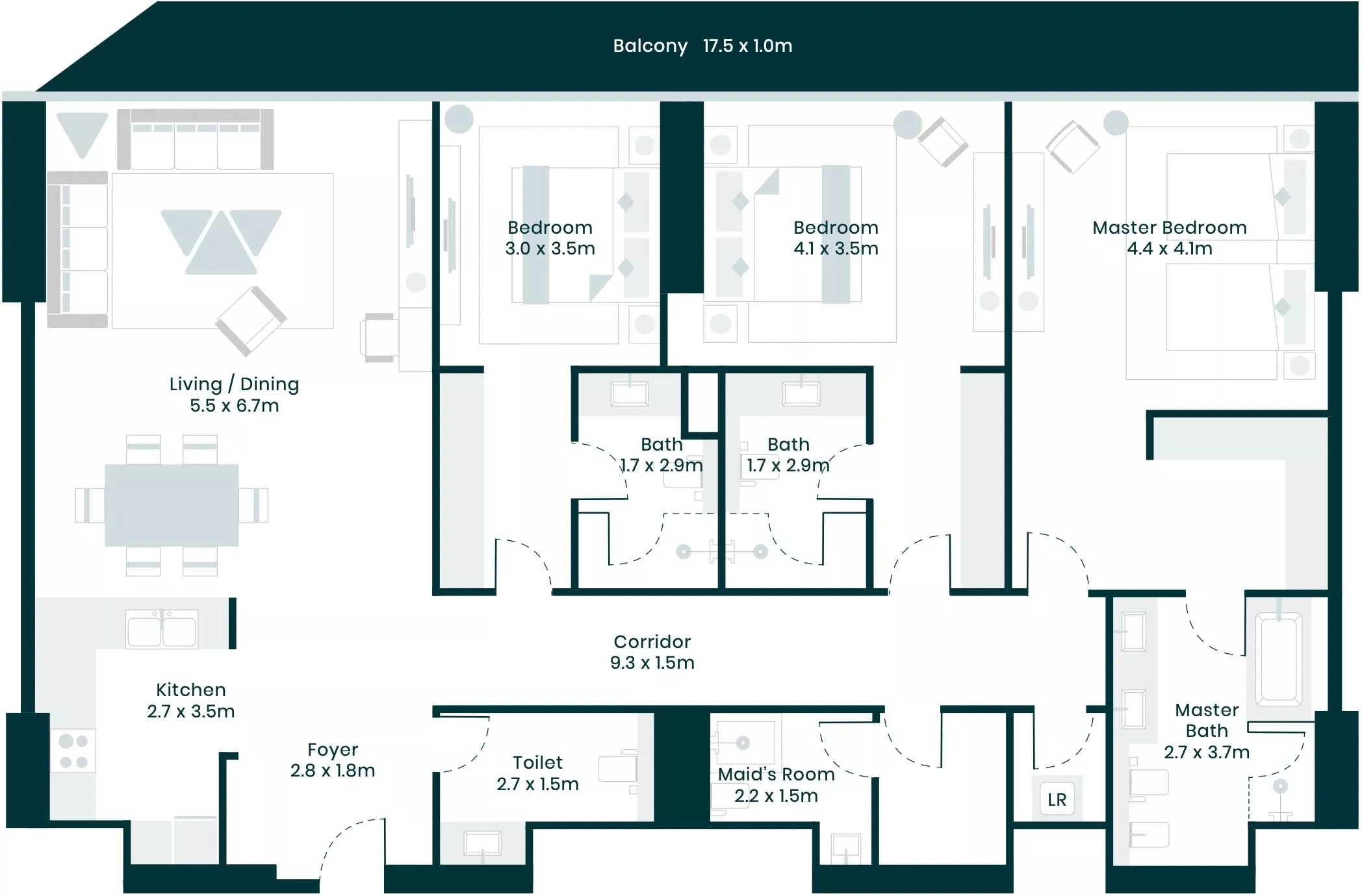 The apartments have an open floor plan and stand out from other similar projects thanks to their spacious layouts and high ceilings. There is at least one balcony for every residence, and in a majority of the 2-4 bedroom apartments there is also a maid’s room and home office.