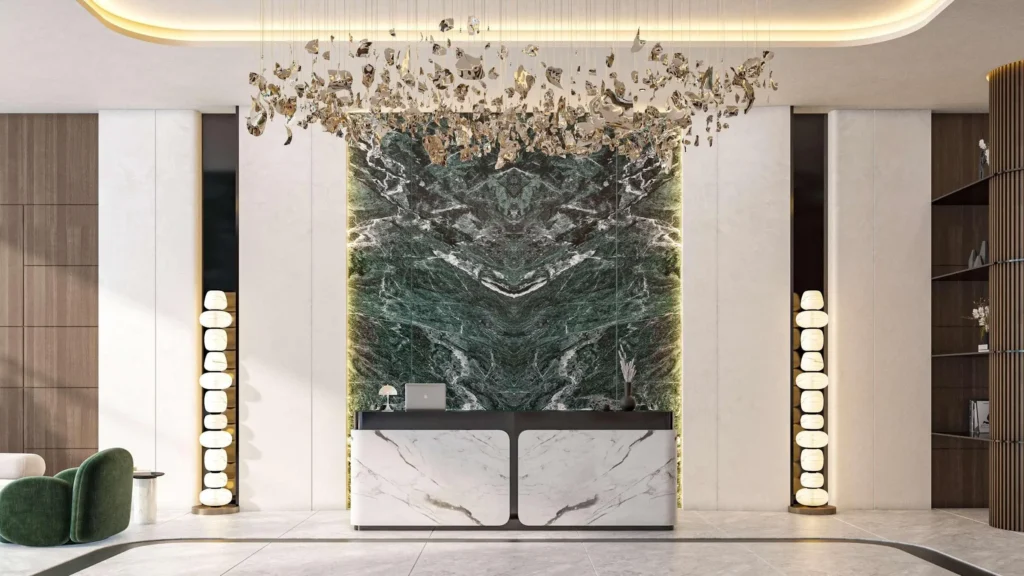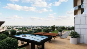A rooftop swimming pool, kids’ pool, yoga areas, and outdoor cinema create a high-usage social and relaxation zone.