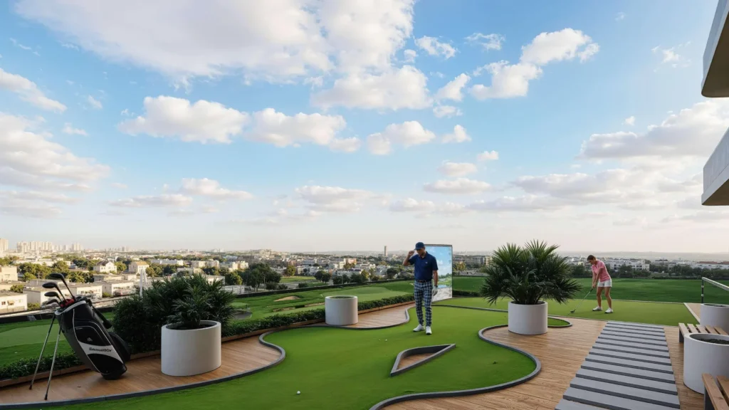 Residents enjoy golf-oriented leisure including an indoor golf simulator and mini golf, enhancing tenant appeal and lifestyle value.