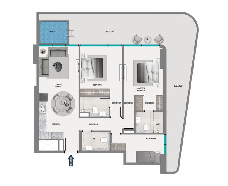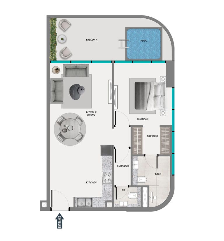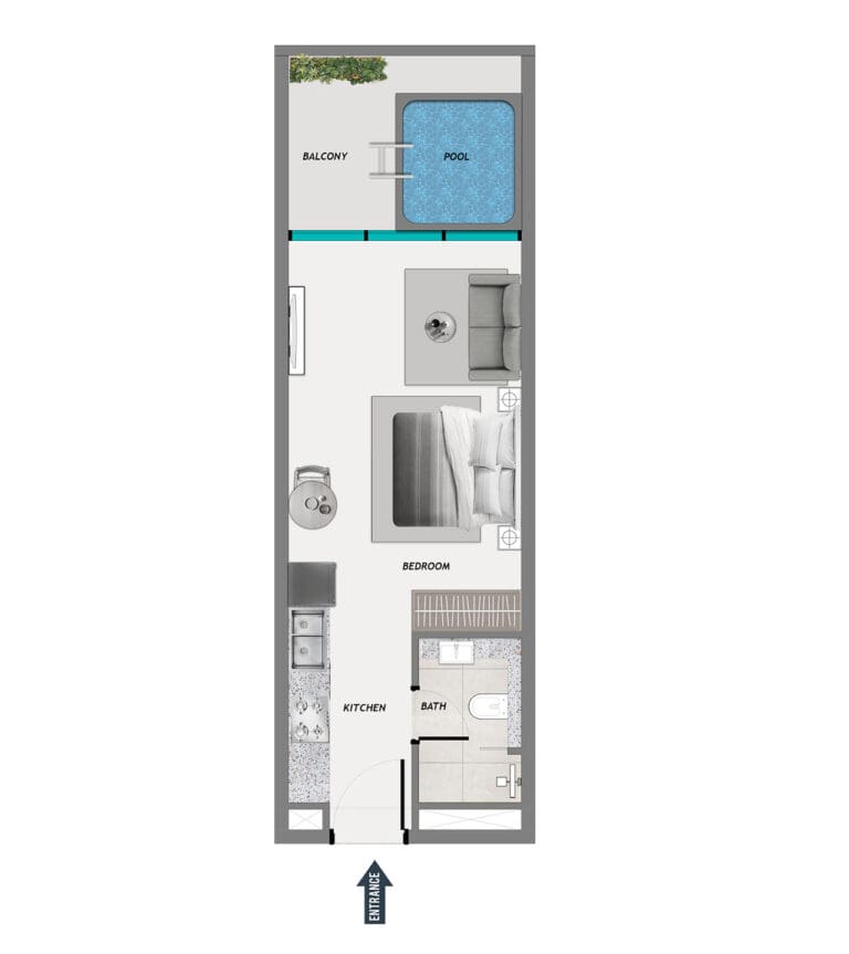 Properties in the project are made up of studios and 1-2 bedroom apartments with an innovative design. All units will be complemented by private swimming pools. The starting price for a studio residence in SAMANA Resorts — AED 852 000 (USD 232K).