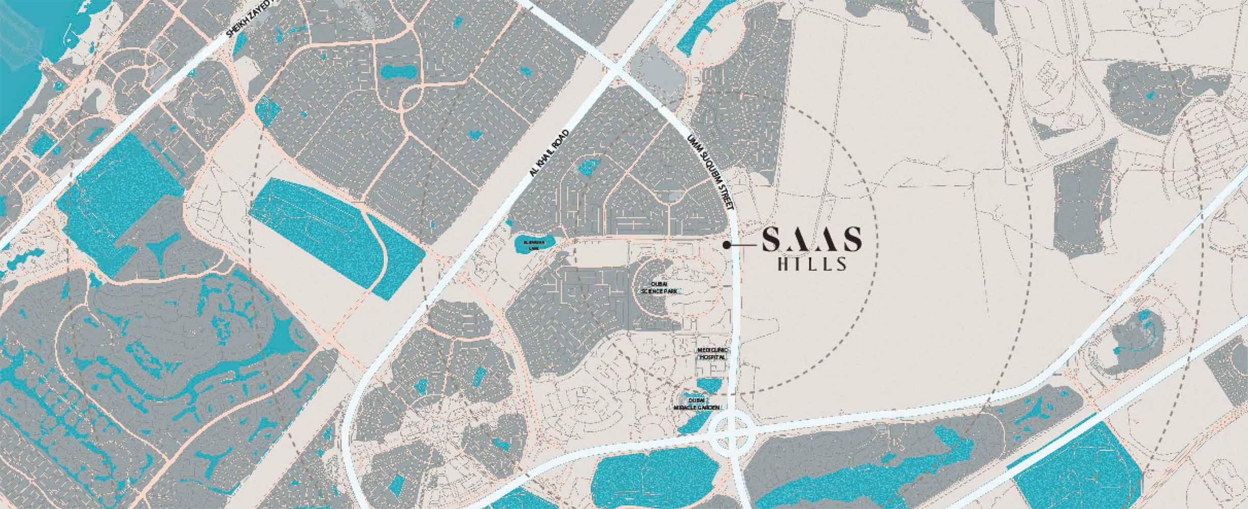 The exquisite development of SAAS Hills is nestled in Dubai Science Park, which is a hub for healthcare, energy and environment sciences. The area is minutes away from business districts like Dubai Hills Business Park, Dubai Media City and Dubai Internet City.