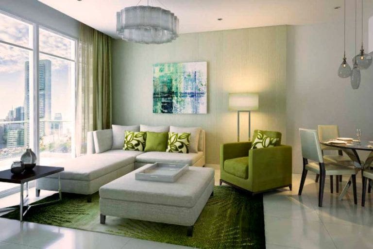 Celestia has studios and one- and two-bedroom apartments for sale and rent. Units range in size from 425 sq. ft. (41 sq. m) to 1,357 sq. ft. (126 sq. m), and prices range from AED 270,000 (USD 74,000) to AED 850,000 (USD 231,000), depending on the type of property.