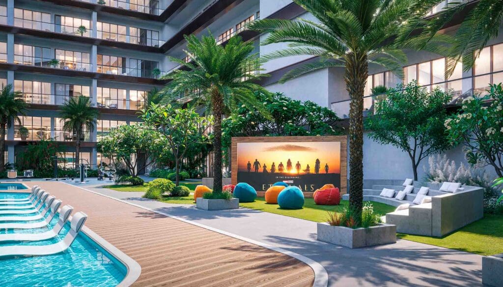 Gratify in an unparalleled lifestyle with the private floating cinema and amphitheater, where residents can enjoy captivating cinematic experiences and live performances amidst a serene, meticulously designed outdoor environment.