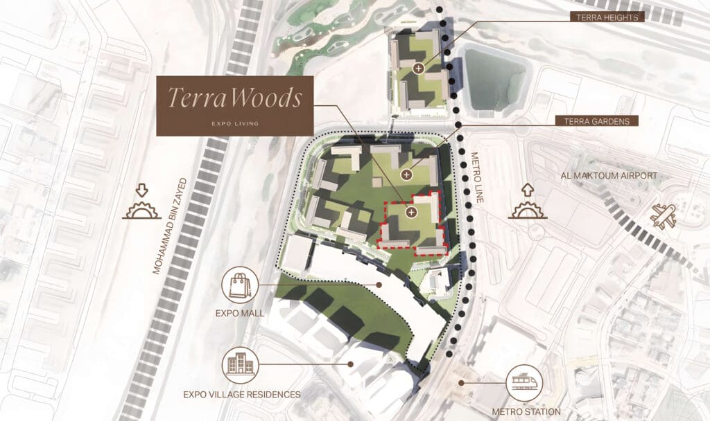 Terra Woods is located in the Expo Living community in Dubai South, adjacent to Expo City and the Dubai Expo Mall, just a 5-minute walk to the Metro station and 10 minutes from Al Maktoum International Airport.