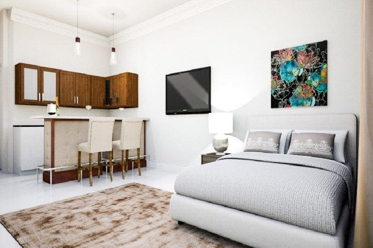 Studios have a minimum size of 33 sq. m (350 sq. ft.).