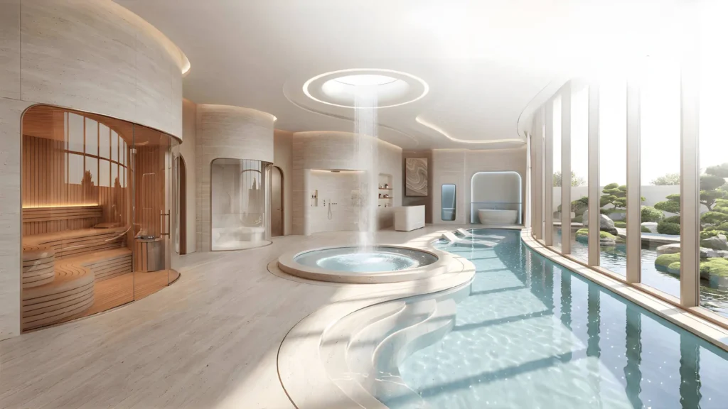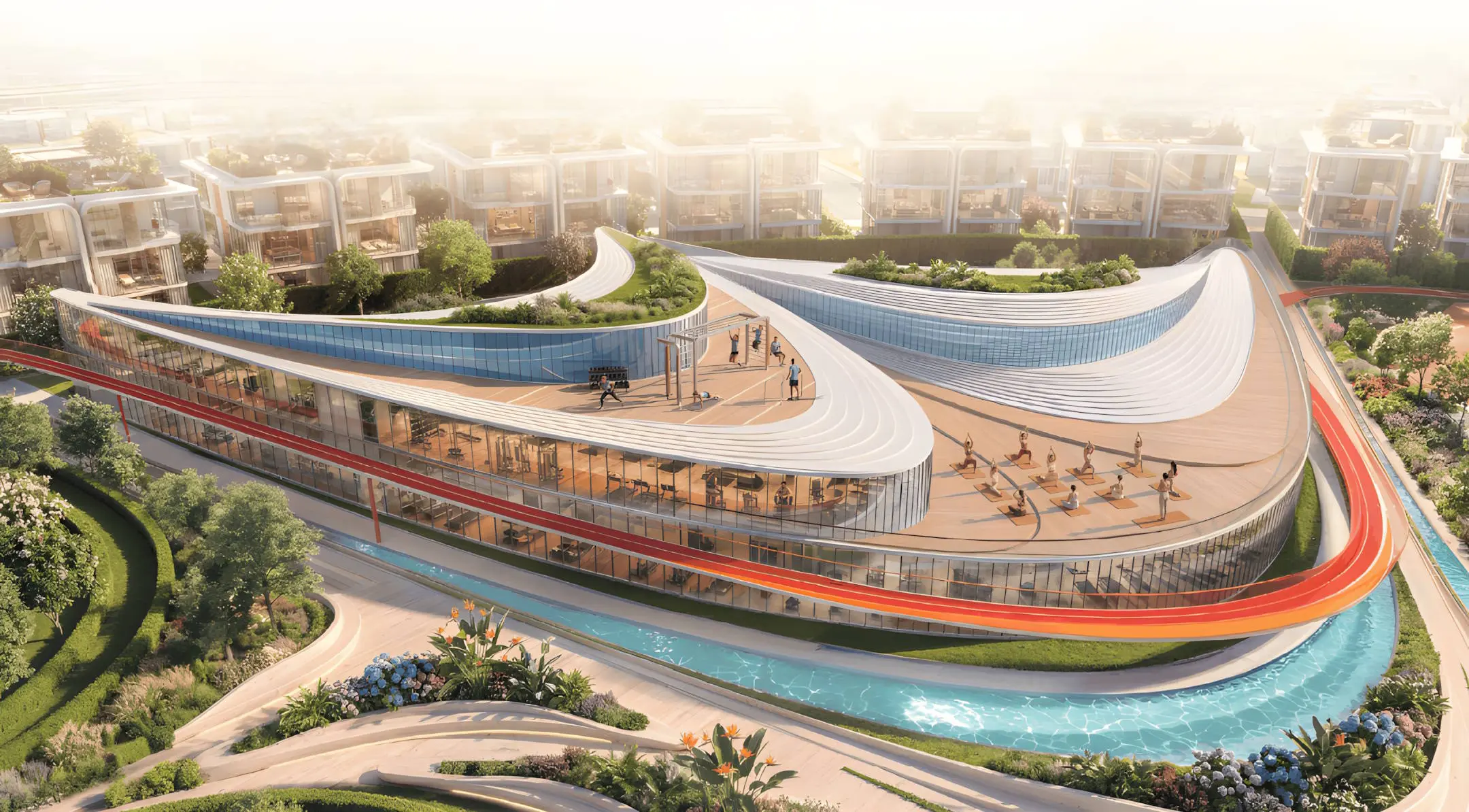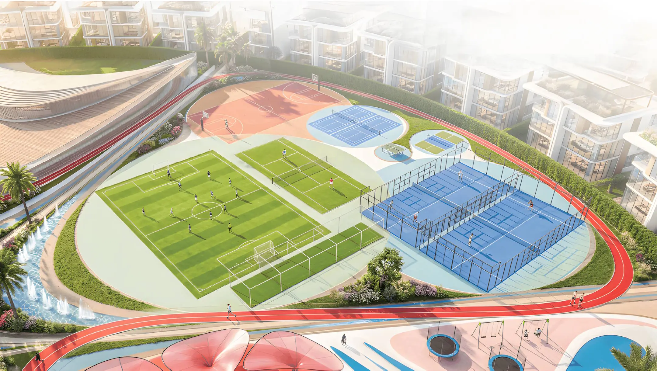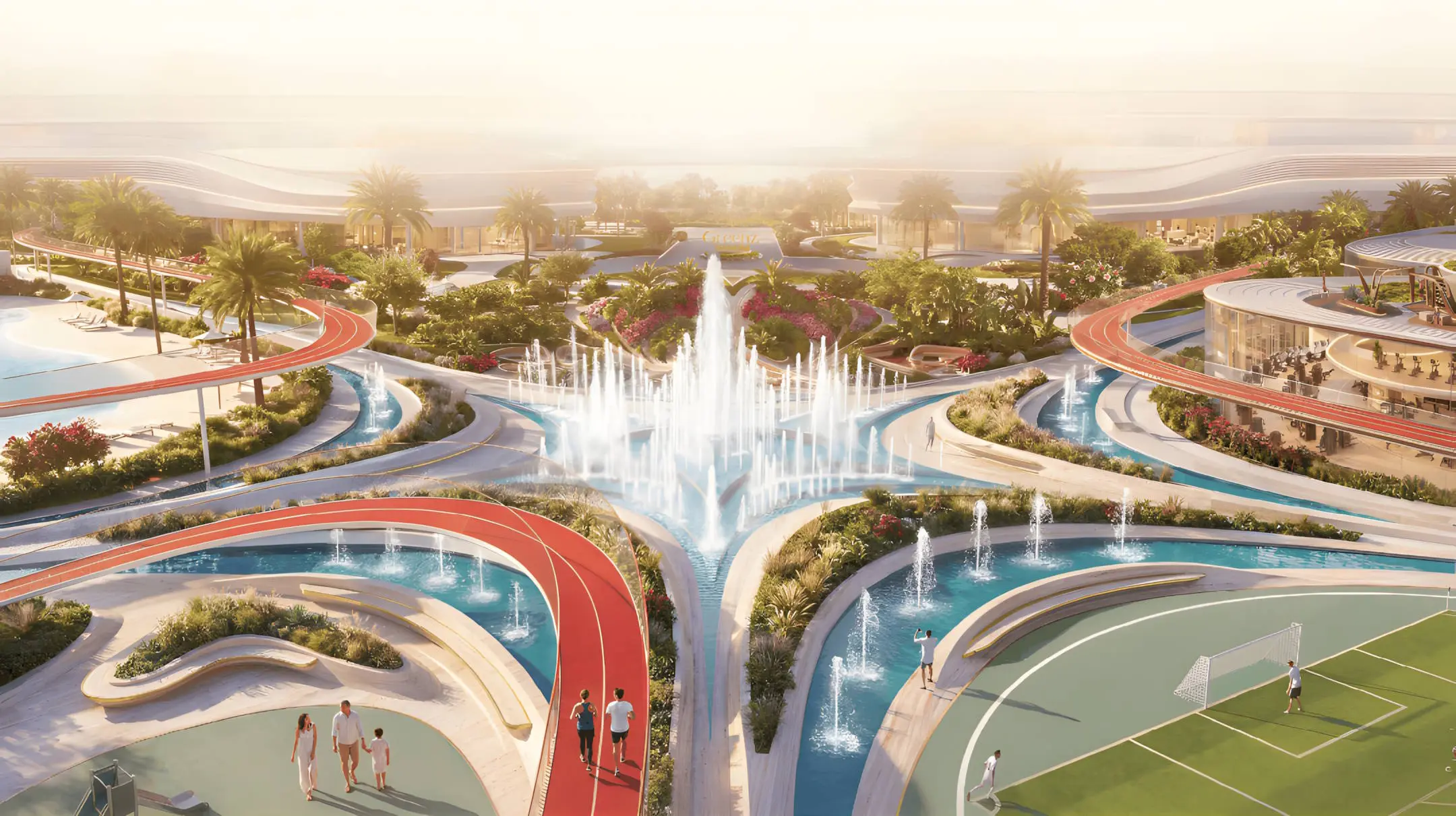 Greenz spans 37,000 sq.m of lifestyle amenities across five hubs: a 20,000 sq.ft wellness centre with spa, sauna, and cryotherapy; 10 sports courts; The Loop — a 3.75 km jogging track; a beachside pool area with three pools; The Dancing Fountain; The Greenz Sanctuary; kids' daycare; a 20,000 sq.ft retail zone; and an on-site Masjid.