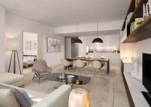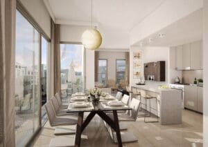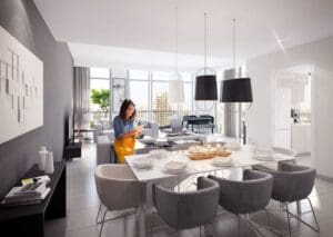 Town Square is designed as a self-contained city with schools, clinics, cinema, retail, parks, and 10 km of outdoor tracks — a comprehensive lifestyle offer particularly well suited for families and long-term residents.