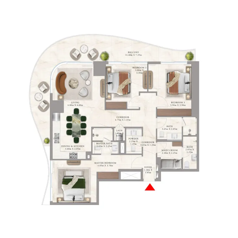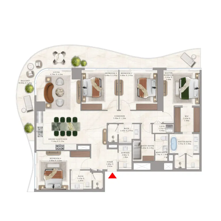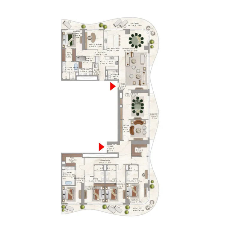 The project offers branded apartments ranging from 1 to 4 bedrooms and luxurious penthouses with 5 bedrooms. Residences range in size from 828 sq. ft. to 6060 sq. ft. Each home features a balconiy and laundry rooms, while configurations with 3-5 bedrooms also include staff quarters. The exclusive luxury penthouses feature additional spaces, including a study and home cinema.