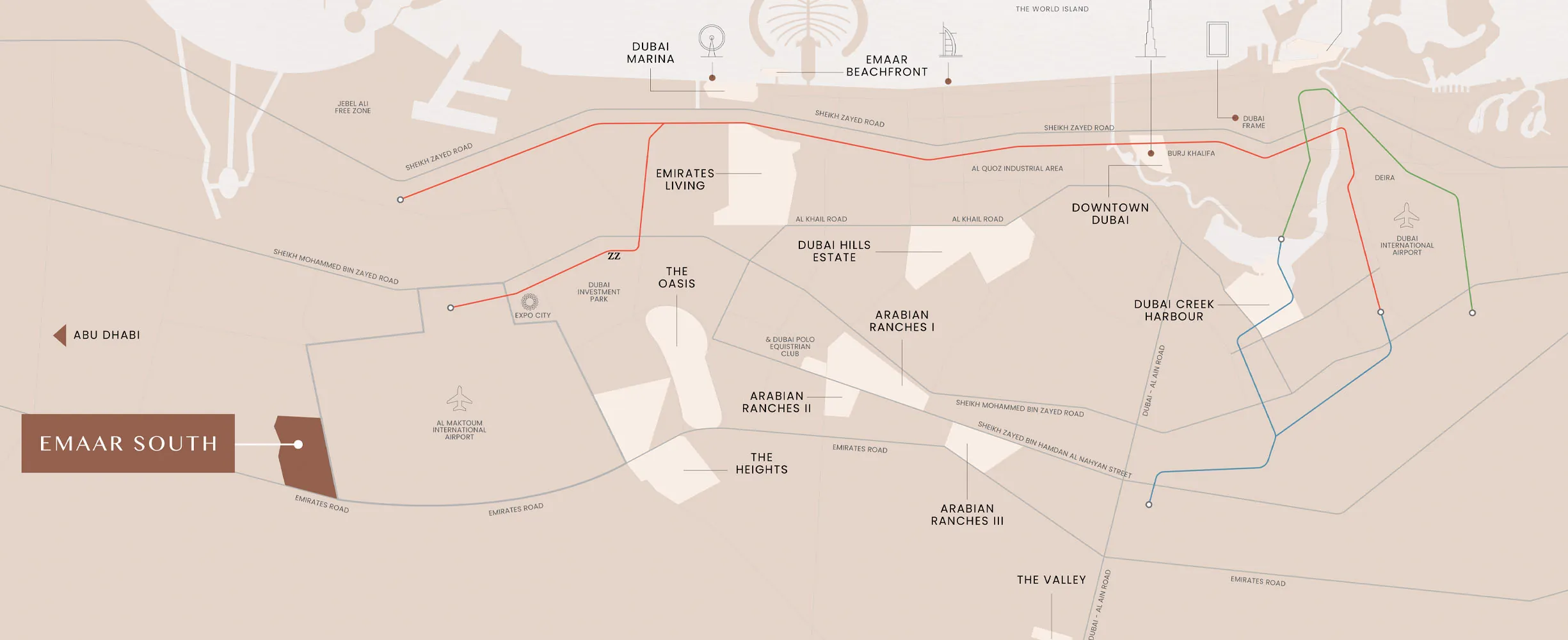 Emaar South is a community in the southern part of Dubai featuring elite residential properties, a championship golf course and twenty-five separate green parks. Approximately 570,500 sq. ft of its area is allocated for retail outlets and food & beverage venues. It is expected to house up to 1 million people.