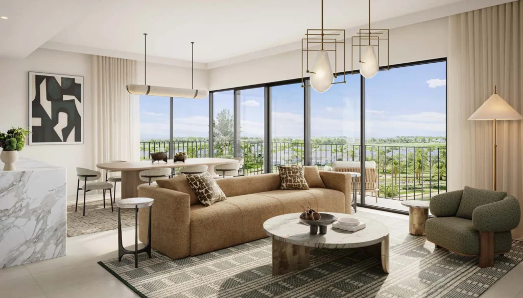 The project offers 1, 2, and 3-bedroom apartments as well as 3-bedroom townhouses, ranging from 671 sq. ft to 3,081 sq. ft, all overlooking greenery and the golf course.
