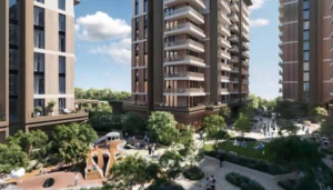 Residential buildings are surrounded by beautifully designed green spaces and water features that create a serene living environment.