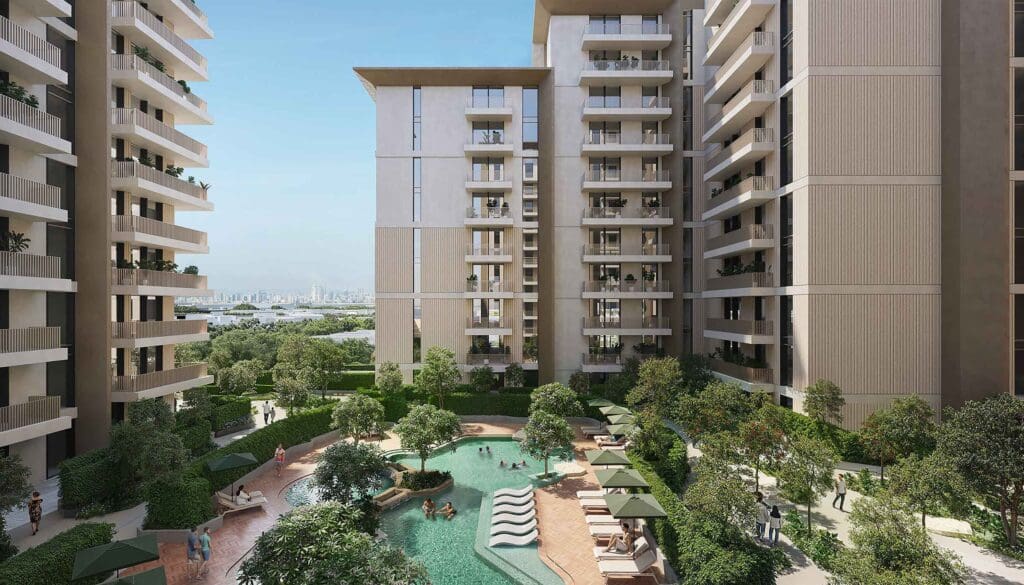MAHRA at Expo Valley Views is envisioned as a fully walkable, shaded complex with wellness terraces, yoga decks, and landscaped courtyards that inspire daily movement, calm, and social connection.