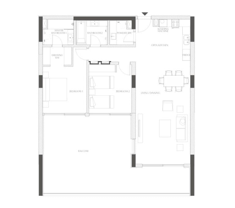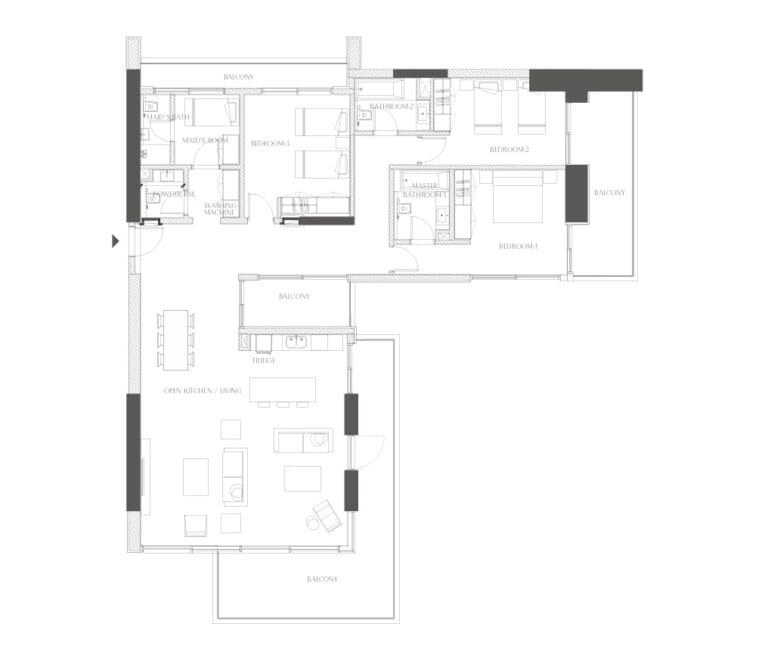 Le bâtiment de 8 étages ne compte que 144 luxueuses résidences de 1 à 3 chambres, d'une superficie de 46 à 269m2. Chaque résidence bénéficie d'un agencement optimisé avec un salon et une spacieuse salle à manger, de hauts plafonds, des fenêtres panoramiques et de grandes terrasses ou balcons. Toutes les chambres sont équipées de dressing, les cuisines sont équipées d'appareils électroménagers de marques européennes modernes et les salles de bains comprennent des appareils sanitaires haut de gamme.