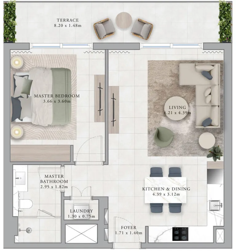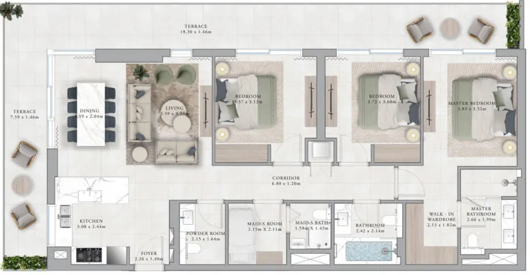 La terrasse panoramique de Club Place, d'une superficie de 665m2, permettra aux résidents de profiter de superbes vues panoramiques sur le quartier verdoyant. Cet espace exclusif offrira le cadre idéal pour y faire des rencontrer, se détendre et profiter de la magnifique Skyline de Dubaï et de son environnement verdoyant.