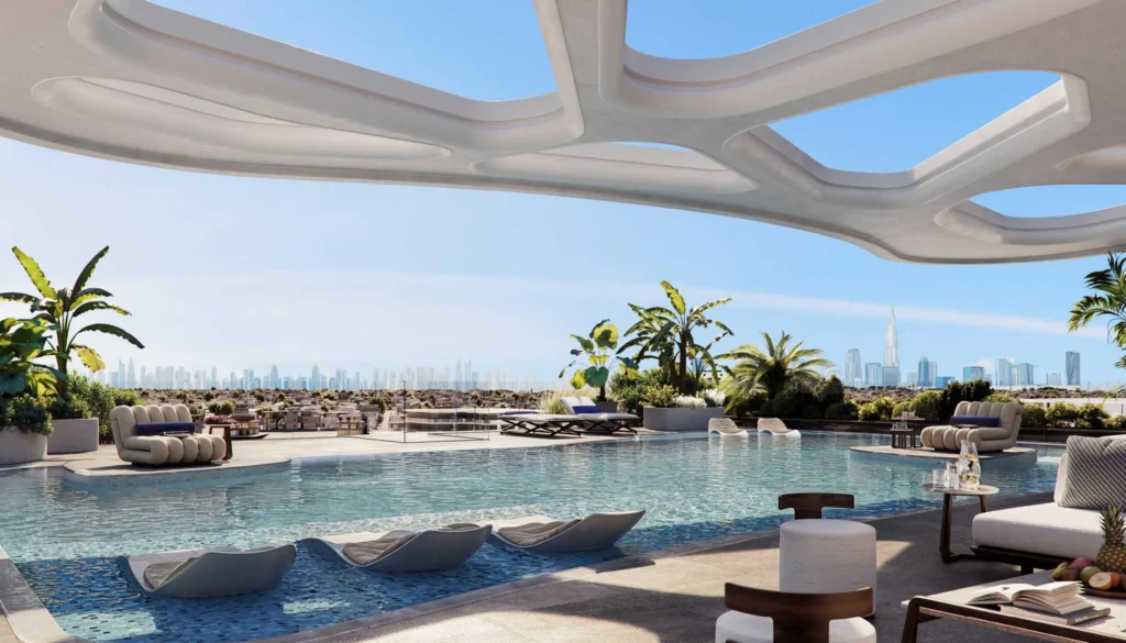 Une piscine à débordement distinctive sur le toit, offrant des vues dégagées sur la mer et la marina, surplombant le littoral de Dubai Islands, renforce l’attrait du style de vie et la demande locative haut de gamme.