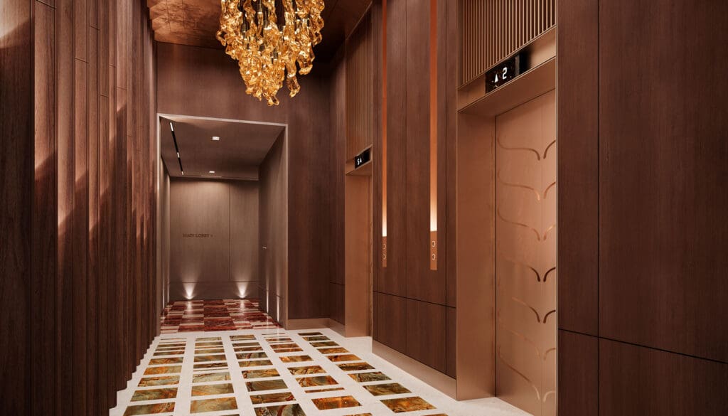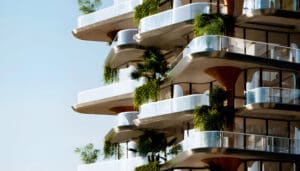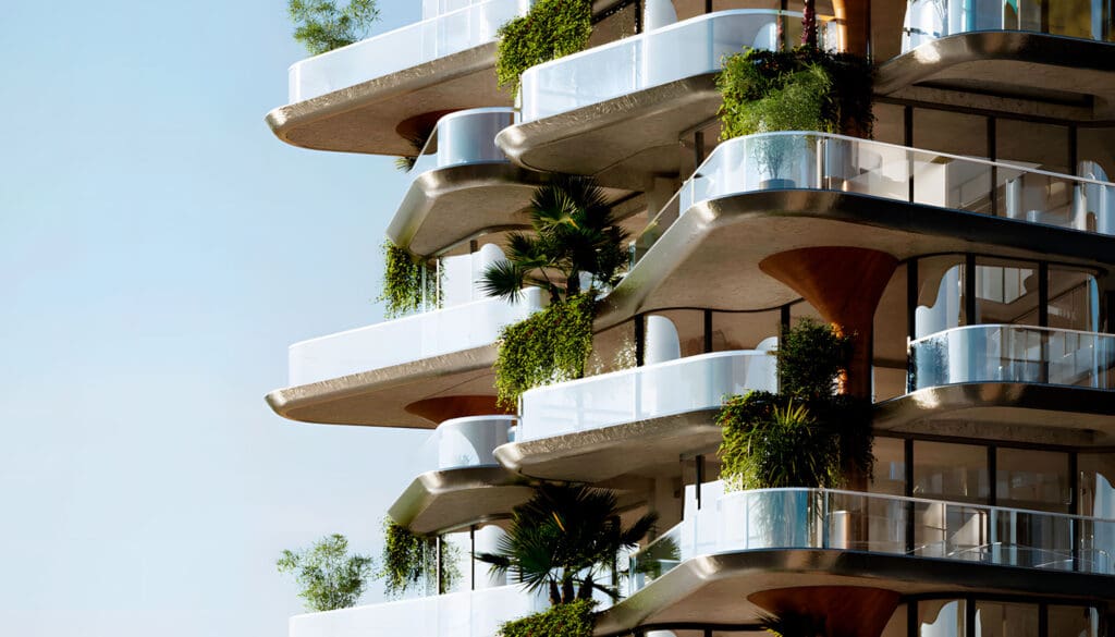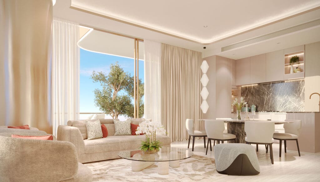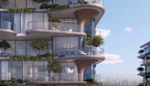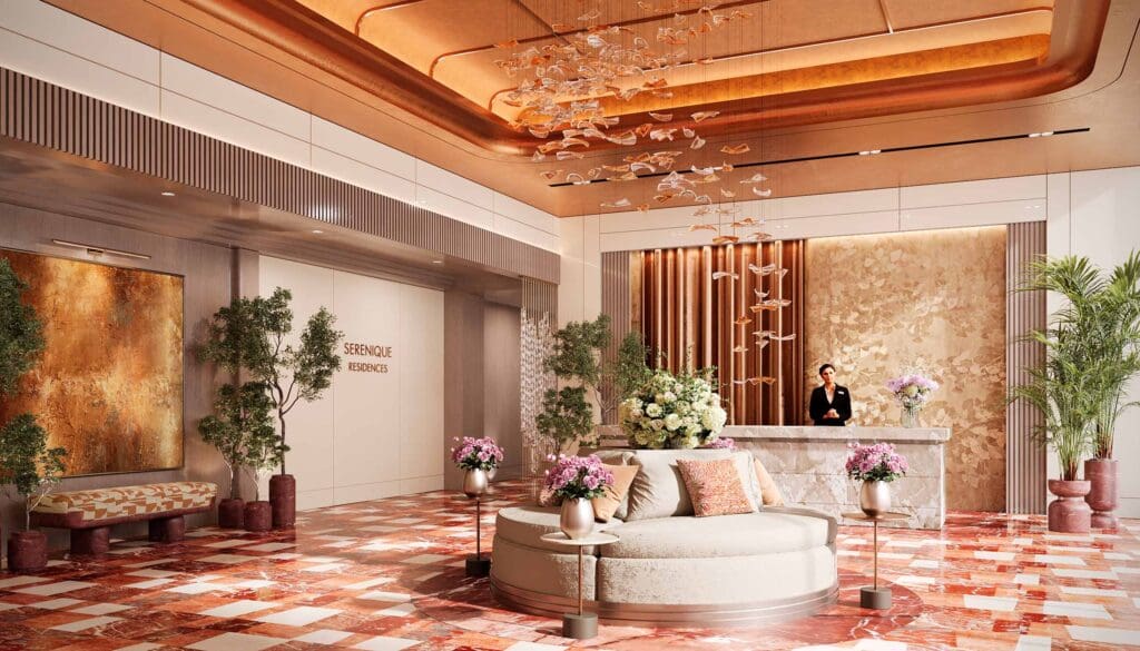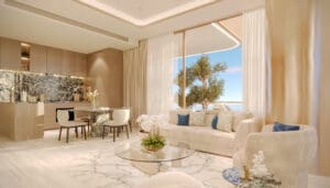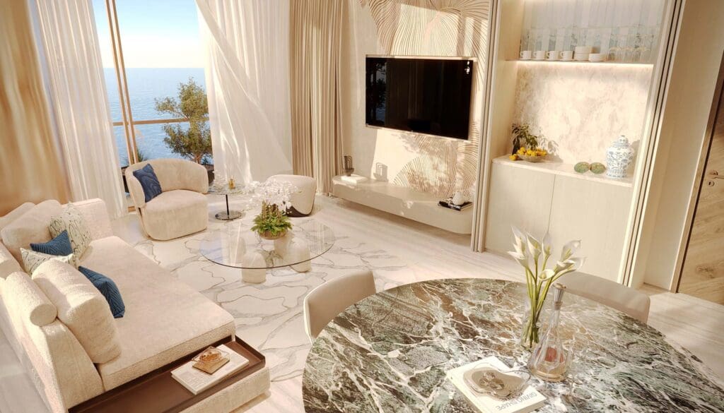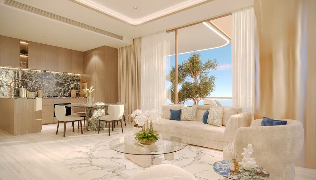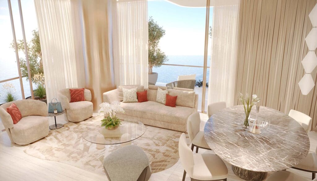 "Serenique Treppan par Fakhruddin Properties est un projet résidentiel composé de deux tours jumelles situé en bord de mer sur les îles de Dubaï.