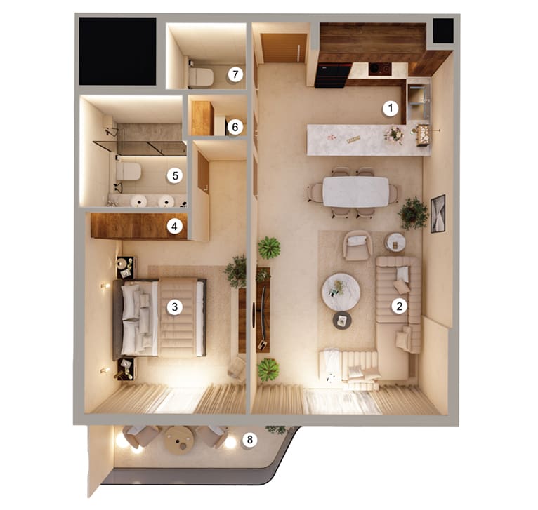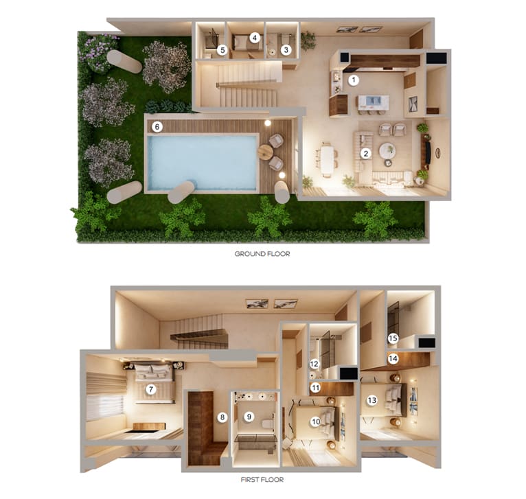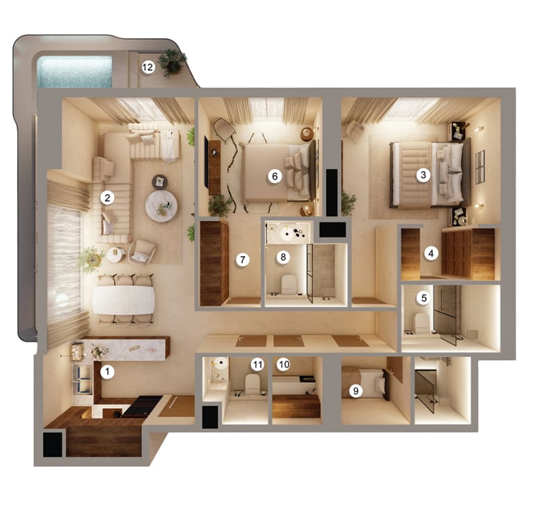 Chaque résidence dispose d'équipements de marque européenne de renom comme que Scavolini, Dornbracht, Villeroy & Boch, et Miele. L'intégration de systèmes domotiques garantit un mode de vie harmonieux, tandis que les plans de travail en travertin italien et les grands balcons soulignent l'élégance et la fluidité entre l'intérieur et l'extérieur. Certains logements offrent également le luxe supplémentaire d'une piscine privée.