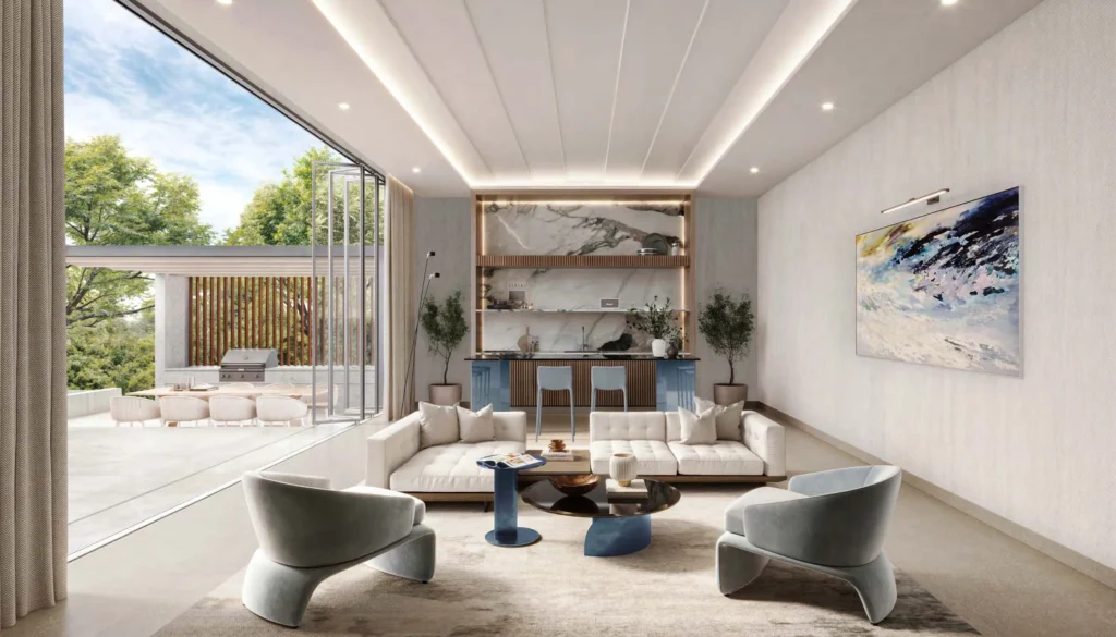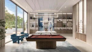 Des zones dédiées au travail et à la vie sociale, comprenant un salon élégant, des espaces de travail partagés et des espaces communs relaxants à la décoration soignée.