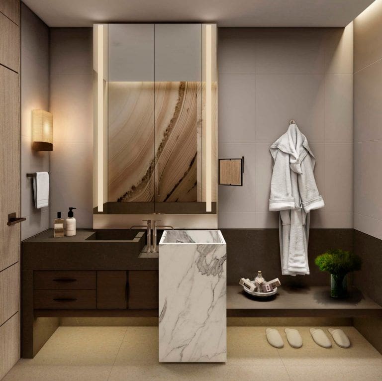 Il y a au total 443 propriétés avec services hôteliers et 478 appartements standard sans ces services. La superficie des propriétés varie de 57 à 466m2. Inspirés par la « Dolce Vita », les intérieurs résidentiels sont conçus dans des tons pastel et bleu clair, et les cuisines sont conçues en mettant l’accent sur la simplicité en étant très fonctionnelles et optimisées, équipées d’appareils des meilleures marques au monde. Tous les appartements sont dotés de placards, de cuisines et de salles de bains complètes, d’un système de domotique, de l’Internet haut débit et de systèmes de sécurité. Chaque chambre est pourvue d’une salle de bain attenante, tandis que les appartements avec services de 2 à 5 chambres sont également pourvus d’espaces pour le personnel.