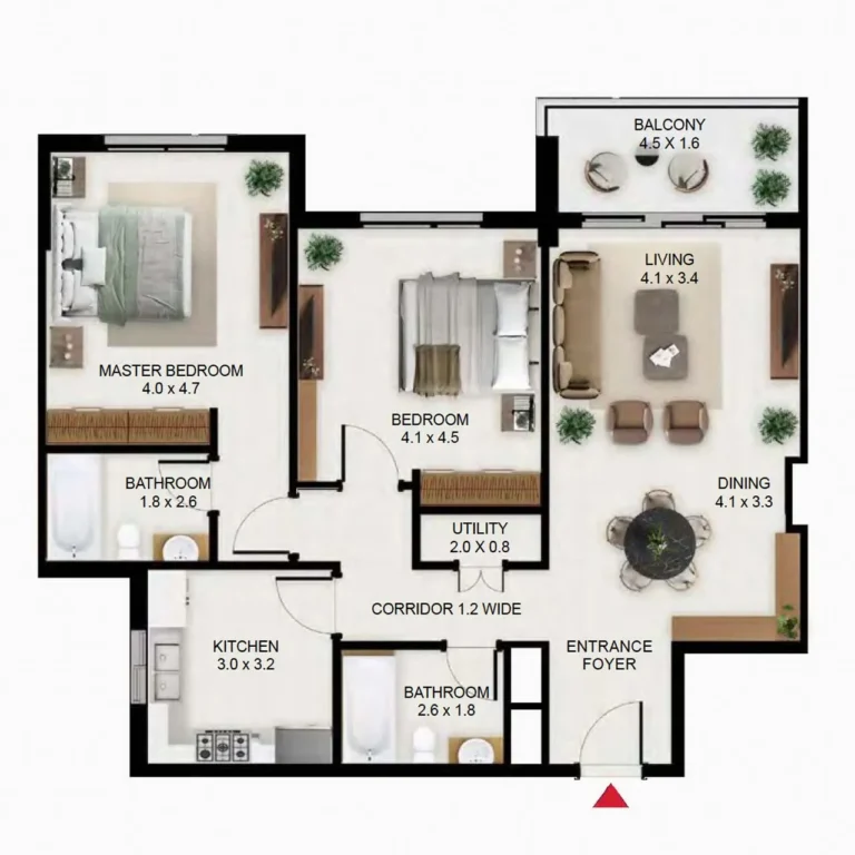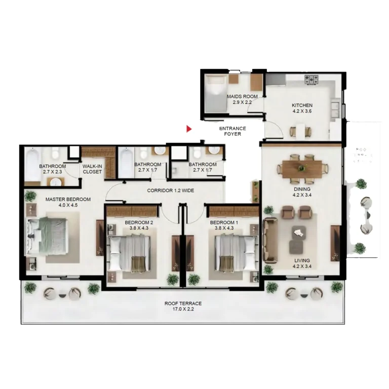 Le projet propose des studios entièrement meublés et des appartements de 1 à 3 chambres, certains avec chambres de service, conçus pour un mode de vie moderne et une forte attractivité d’investissement.