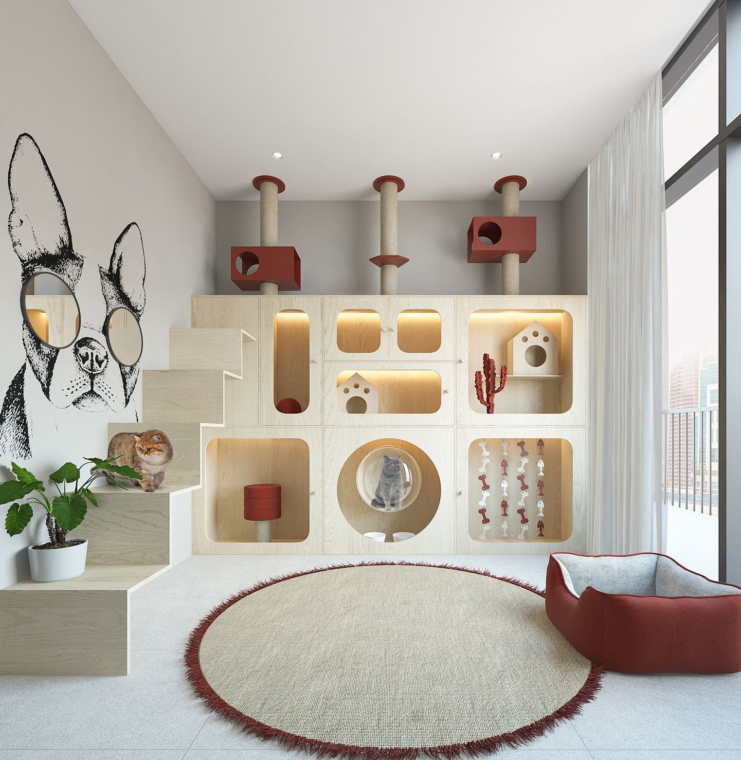 Les aménagements peuvent inclure un balcon, un dressing, une salle d’eau et un espace de rangement. La cuisine est équipée d’appareils électroménagers intégrés et d’un comptoir moderne servant également de bureau. Les salles de bains sont complétées par des armoires à glace, un espace de présentation et des étagères.