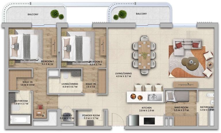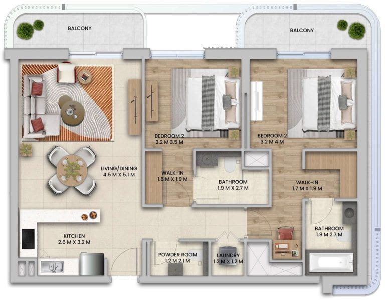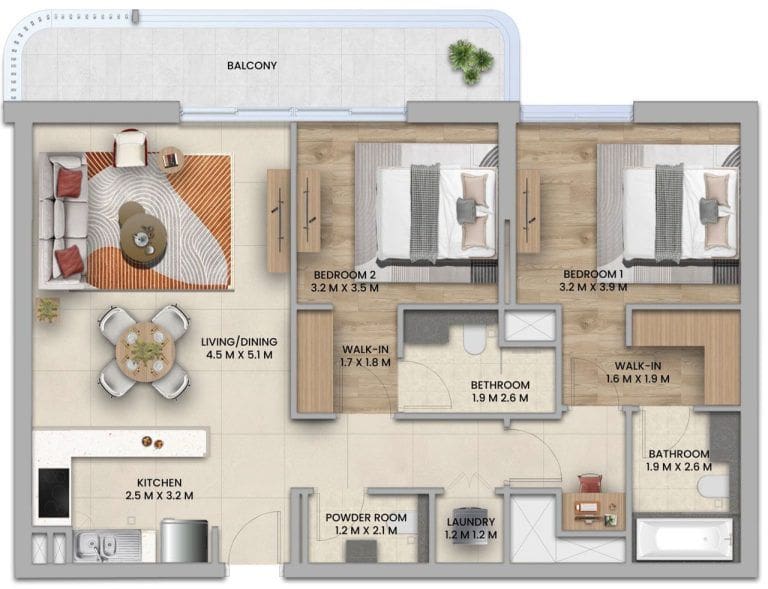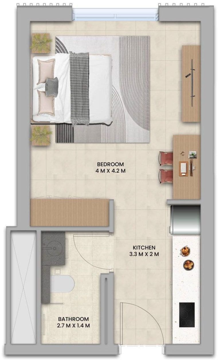 Les salles de bains disposent de sols stratifiés, de carrelages de qualité et d'une robinetterie haut de gamme. Les cuisines ouvertes et semi-ouvertes sont équipées de meubles de haute qualité et les plans de travail sont en quartz. Toutes les chambres sont équipées de spacieuses armoires encastrées. Chaque résidence, à l'exception des studios, dispose d'au moins un balcon. Certains des appartements de 2 à 3 chambres disposent d'une chambre séparée pour le personnel de service.