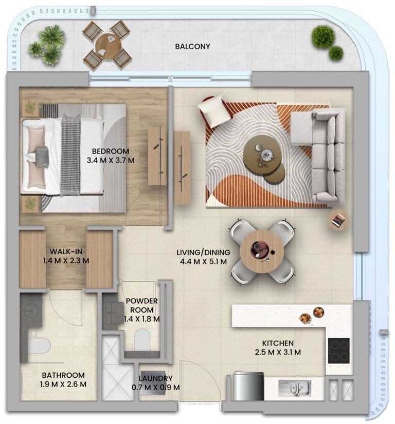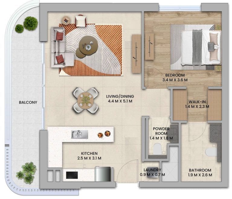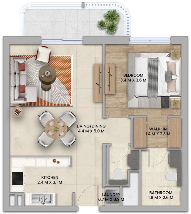 Nouran Living propose une élégante sélection de 372 résidences, composées de studios et d'appartements de 1 à 3 chambres. Leur superficie totale va de 30 à 234m². Des matériaux naturels et des couleurs claires ont été choisis pour la décoration et l'intérieur est complété par des tons contrastés de gris, de basalte et de graphite.