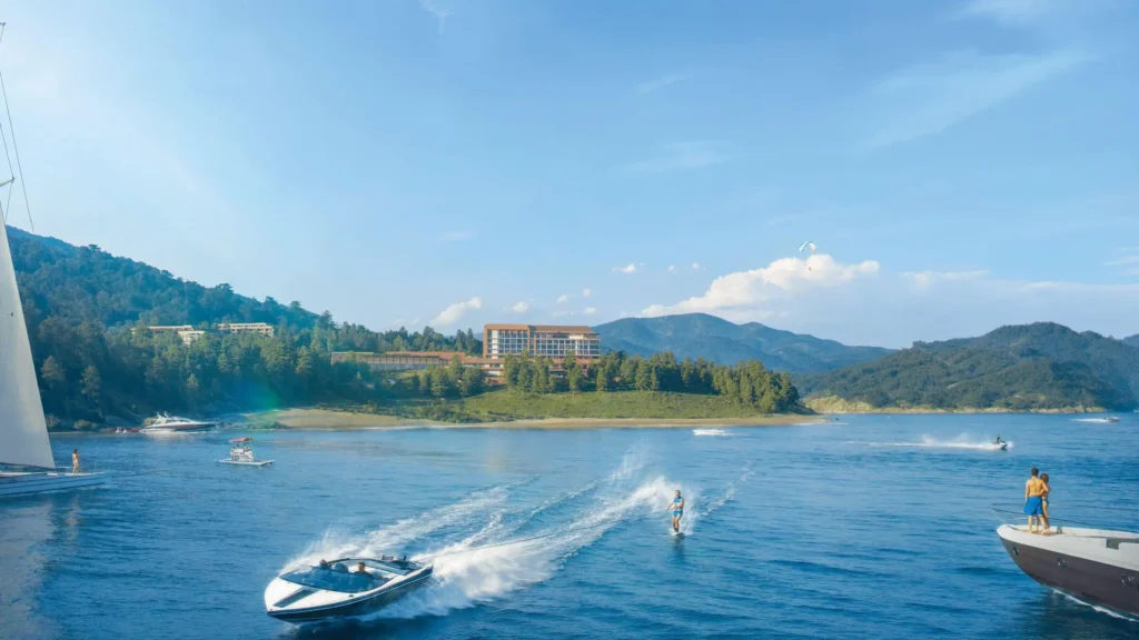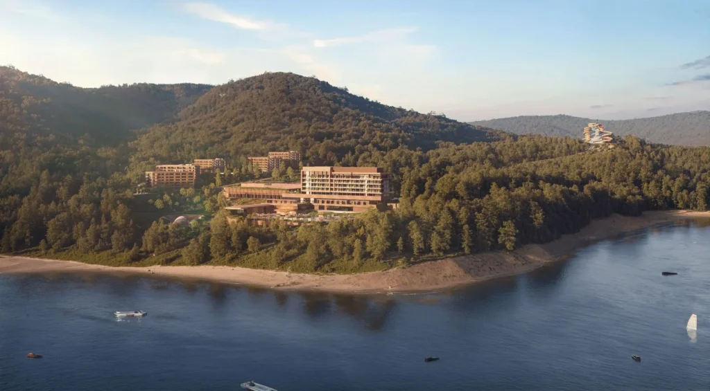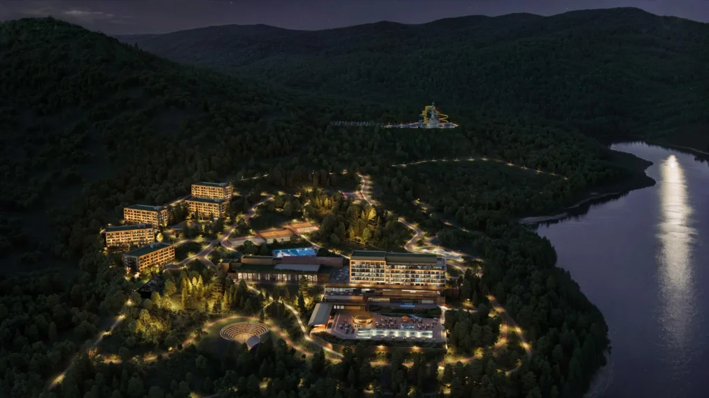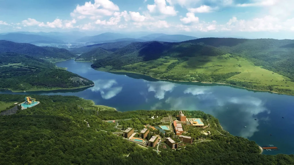 Georgia's one-of-a-kind mountain resort on the shores of Lake Sioni at 1,100m — with year-round premium infrastructure including a 3,000 sq.m spa, aquapark, five restaurants, amphitheatre, ice rink and helipad. Projected rental yield — 10% annually.
