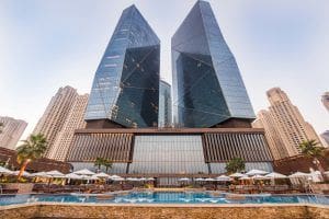 Al Fattan Crystal Towers is a residential project located on the Arabian Gulf in Jumeirah Beach Residence (JBR). The complex includes two towers featuring modern architecture and comfortable living accommodations. The buildings offer many upscale amenities and recreation areas, as well as a fashionable Rixos hotel. Developed by Al Fattan Properties, the complex consists of Tower A with 38 floors and Tower B with 33 floors. Penthouses and apartments are available with one, two, three, and four-bedroom floor plans. Both buildings share a common podium with a shopping centre and restaurants.