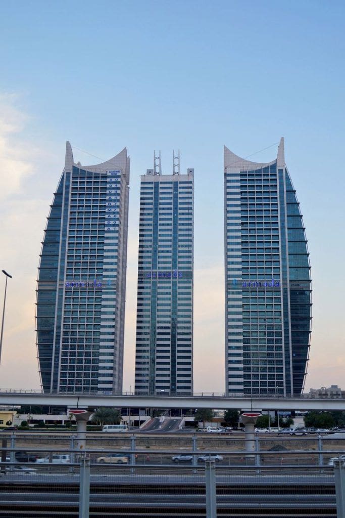 Armada Towers is a residential complex located in Jumeirah Lakes Towers, Dubai. Commissioned in 2010, the project was developed by Armada Group and consists of three high-rise buildings: Towers 1, 2, and 3. The architectural design was implemented by Adnan Saffarin, and the buildings form the shape of three ships that are sailing in different directions. Tower 1 has 36 floors. Tower 2 has 40 floors, and Tower 3 has 33 floors. The first and third towers consist of residential units, and the second tower has commercial space and a 78-room hotel, Armada BlueBay.