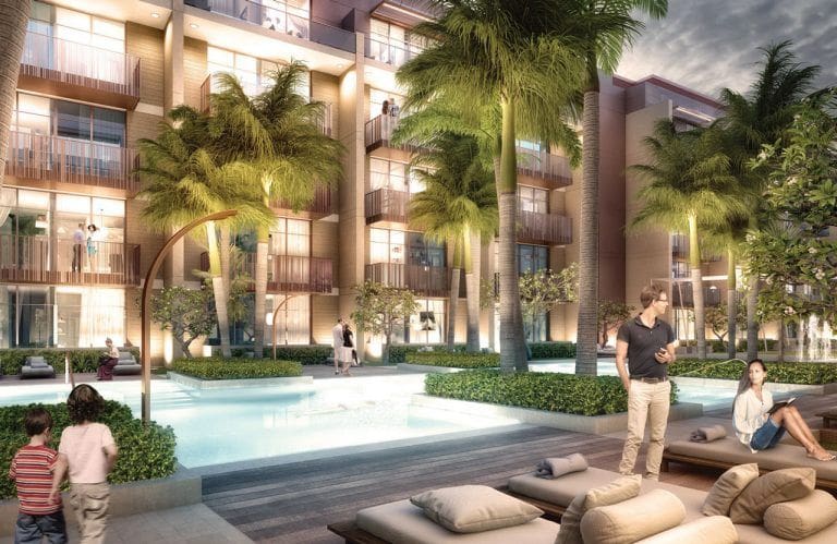 Apartments range in size from 800 sq. ft (244 sq. m) to 1800 sq. ft (549 sq. m), depending on the number of bedrooms and layout. Prices range from AED 725,000 (USD 198,000) to AED 1,900,000 (USD 518,000). Each unit has an American-style design with spacious bedrooms, en-suite bathrooms, and built-in walk-in closets. Other features include large living rooms combined with dining rooms, laundry rooms, and balconies with beautiful views of the surrounding landscape.