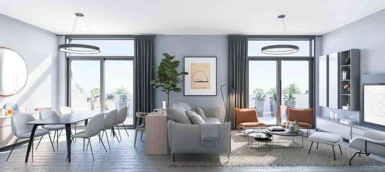 Studios are available in six different configurations and have an average size of 510 sq. ft (156 sq. m). A typical layout features a spacious terrace, comfortable sleeping space, open living area, and fully-equipped kitchen. Units offer practical floor plans and beautiful interiors. The price of a studio is approximately AED 520,000 (USD 142,000).