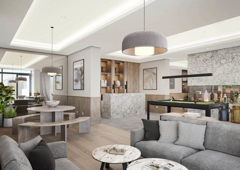 Building amenities include covered parking, high-speed elevators, concierge services, and on-site security. Residents can also enjoy the complex’s private event space, fitness centre, pool table, recreation area, indoor playground, and pools for adults and children.