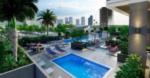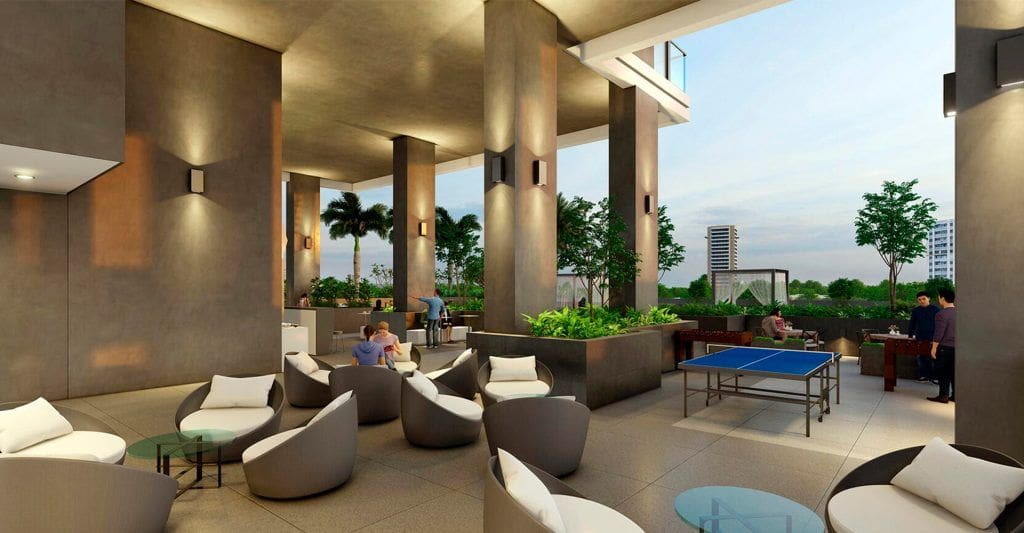 Miami style sun deck with chic cabana’s and sun lounger zones Adult pool with sparkling waterfall feature • Kids pools with safety specifications Fresh Daily, juice station State of the art gym and fitness suite Barbeque garden with family seating areas Residents Game Zone with ping pong, foosball and social areas Multipurpose community room with flexible layouts for community events, parties, tv room and drinks station.