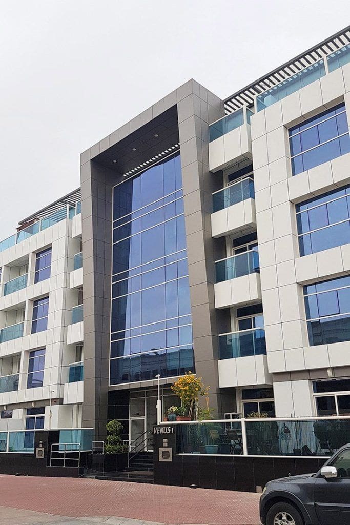 Venus Residence is a five-storey residential complex located in Jumeirah Village Circle, Dubai. The project was developed by Nakheel, and the architectural design was implemented by Hatim Al Ghaouti and Al Asri Engineering Consultant. The building features a modern style, and the façade consists of white blocks and glazed elements. The entrance and centre of the building are highlighted by a dark block in the form of a projecting arch. Properties include one- to two-bedroom apartments that have spacious layouts. One-bedroom apartments cover an area of 850 sq. ft. and are the most popular option among tenants.