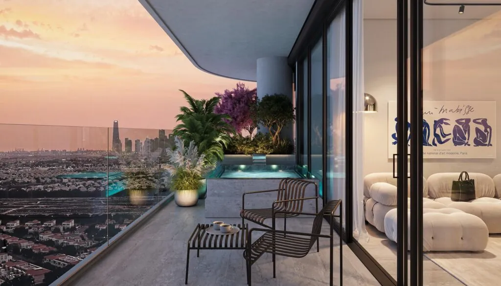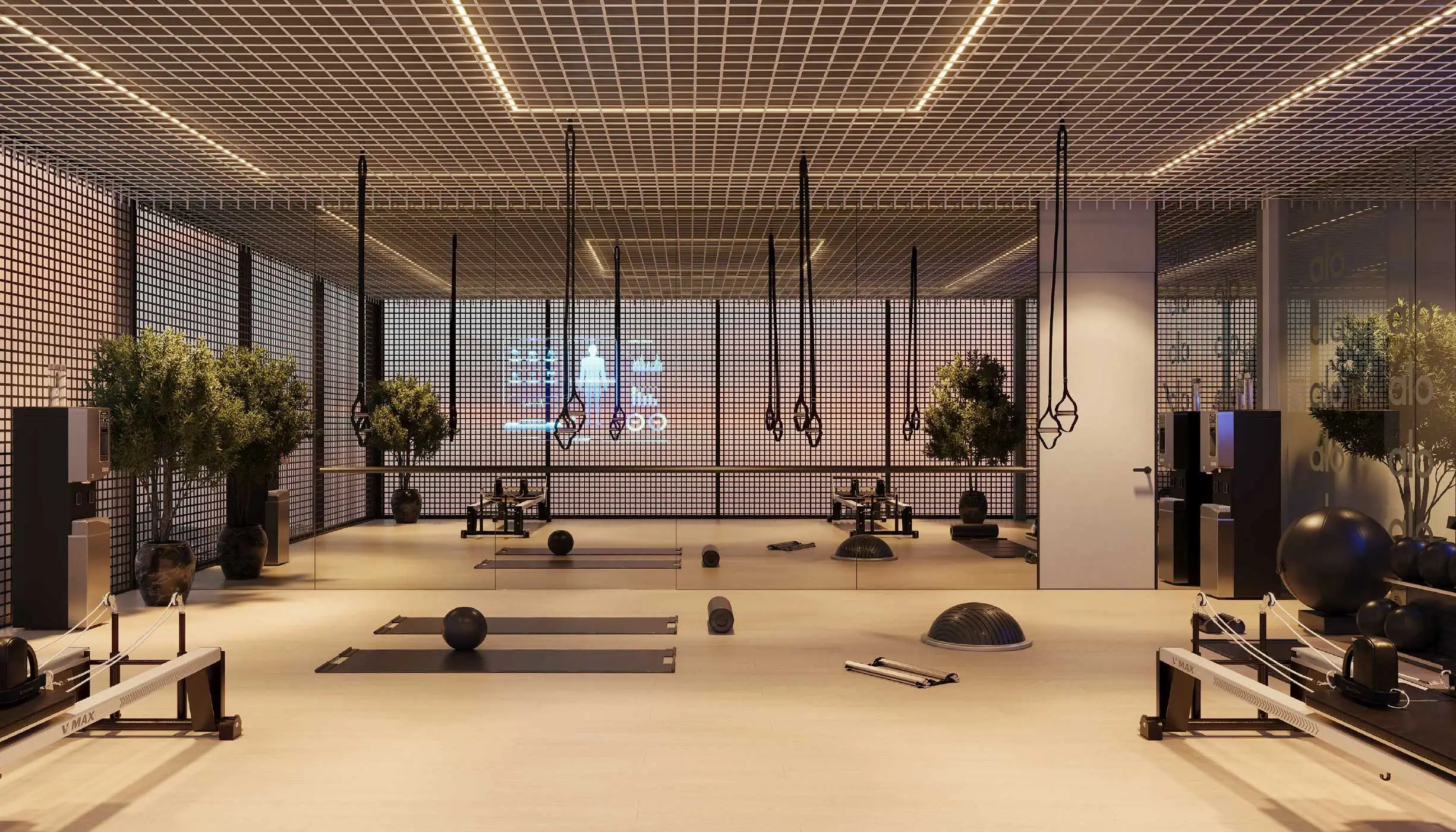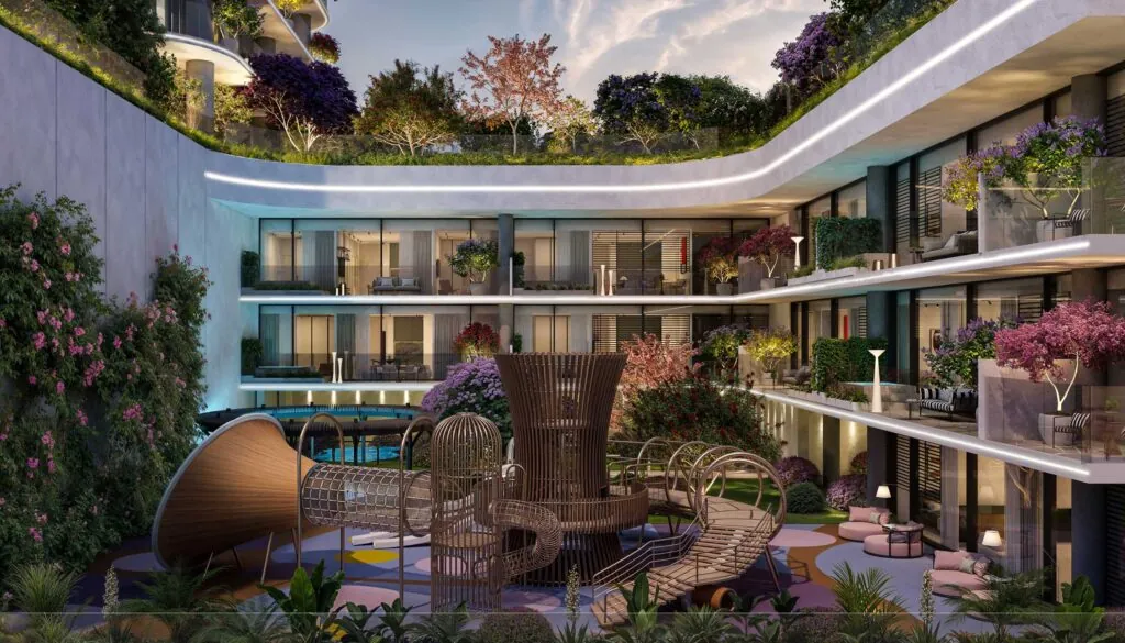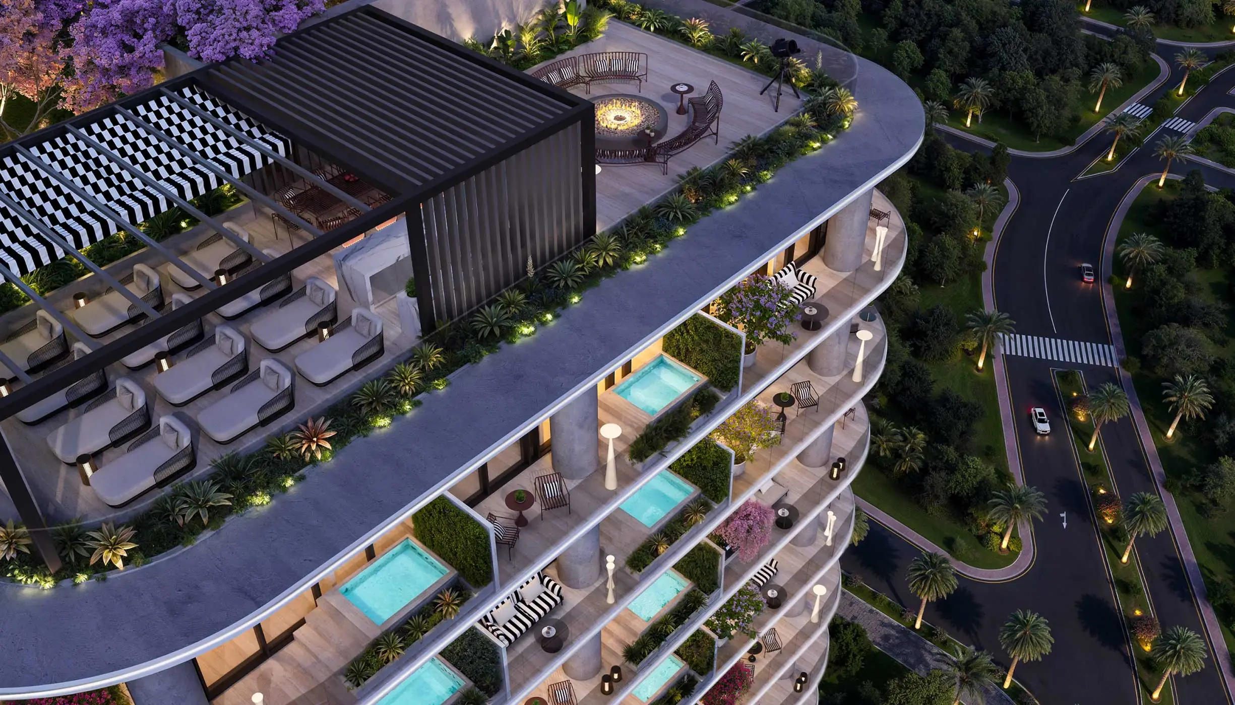 Residents enjoy a rooftop slow river, infinity pools, tennis and padel courts, a rooftop observatory and cinema, wellness spa, gym, concierge services, private transport, and more.