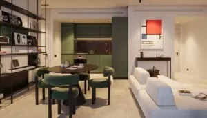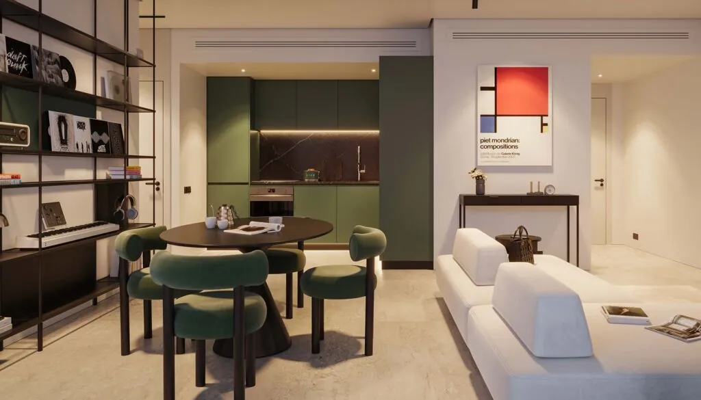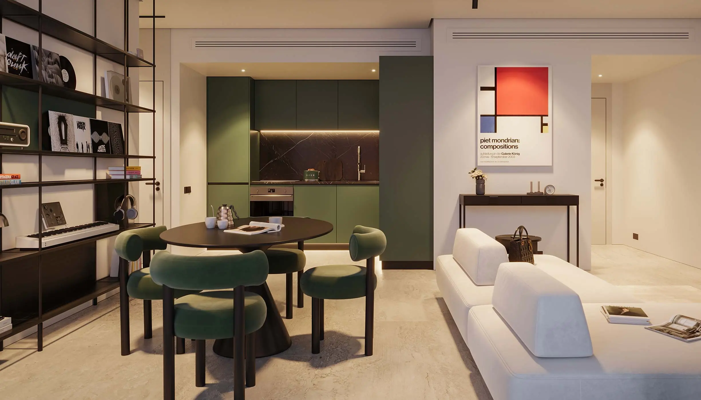 The project features branded 1–3 bedroom apartments, premium office spaces, and retail units, all crafted with high-end finishes and bespoke furnishings.