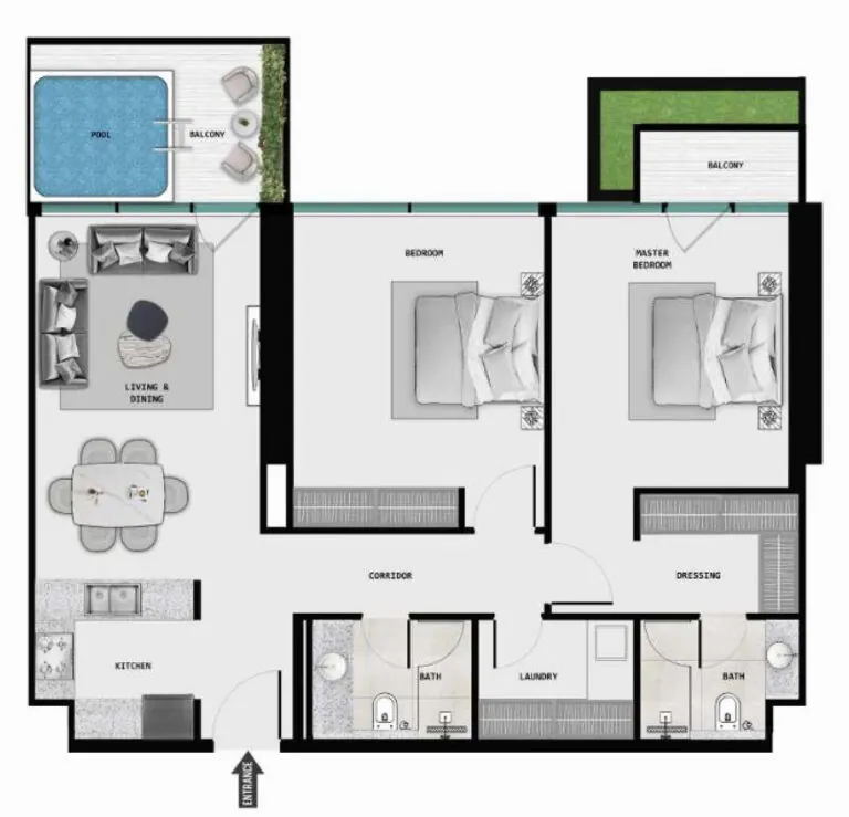 The project offers studios, 1-3 bedroom apartments, and 2-bedroom duplexes, each featuring a private pool balcony.