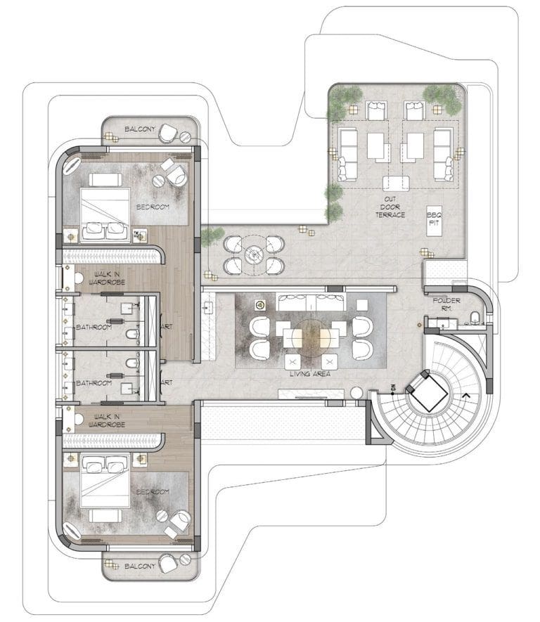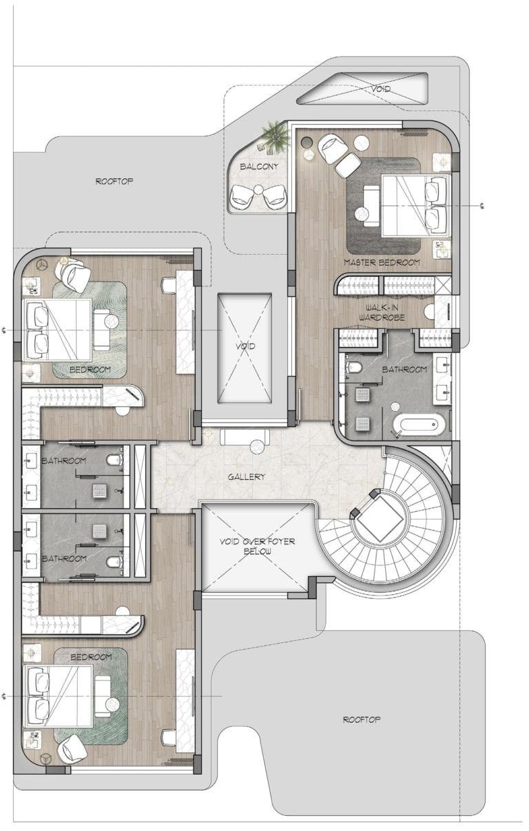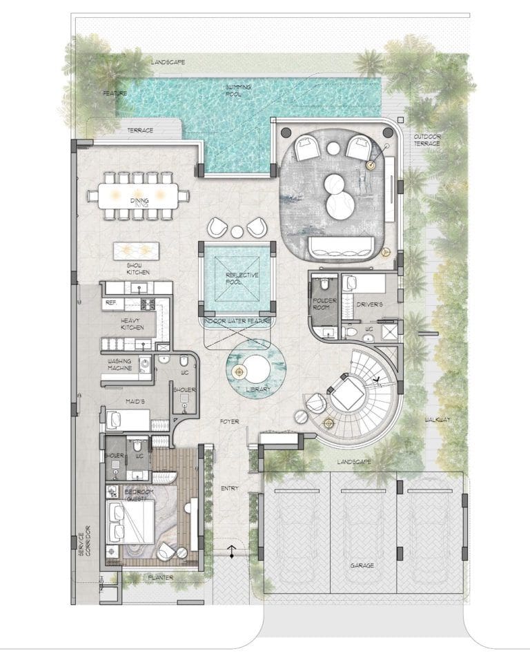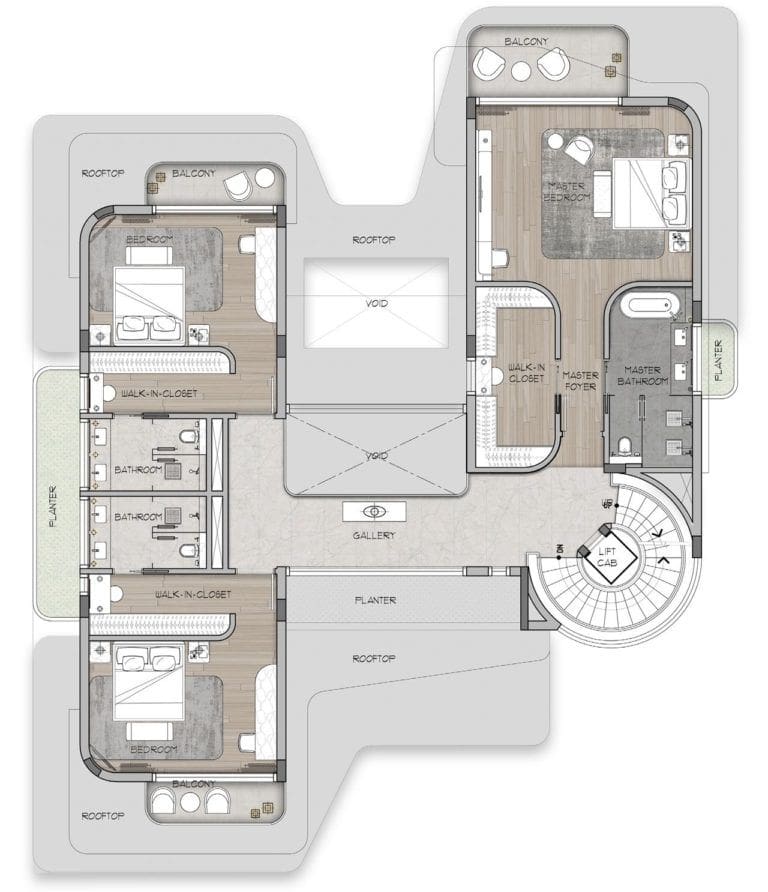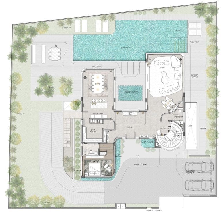 Property sizes range from 6,500 sq. ft. to 16,000 sq. ft. All homes will have a double-height entrance, spiral staircase, lift, private swimming pool and covered parking for 2–6 cars.