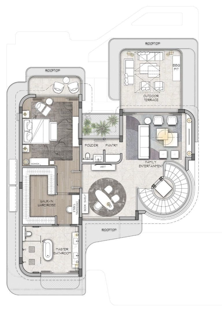 Residents of the 4-bedroom villas will enjoy picturesque views of the surroundings from their roof, where there will also be an open terrace with a lounge bar, mini-bar and barbecue area. On the top floor of the 5-bedroom villas, there will be a master bedroom, dressing room with a vanity table, family relaxation area and a terrace equipped for barbecuing.