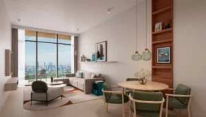 The development offers fully furnished 1–2BR branded residences from 633 to 1,085 sq.ft.