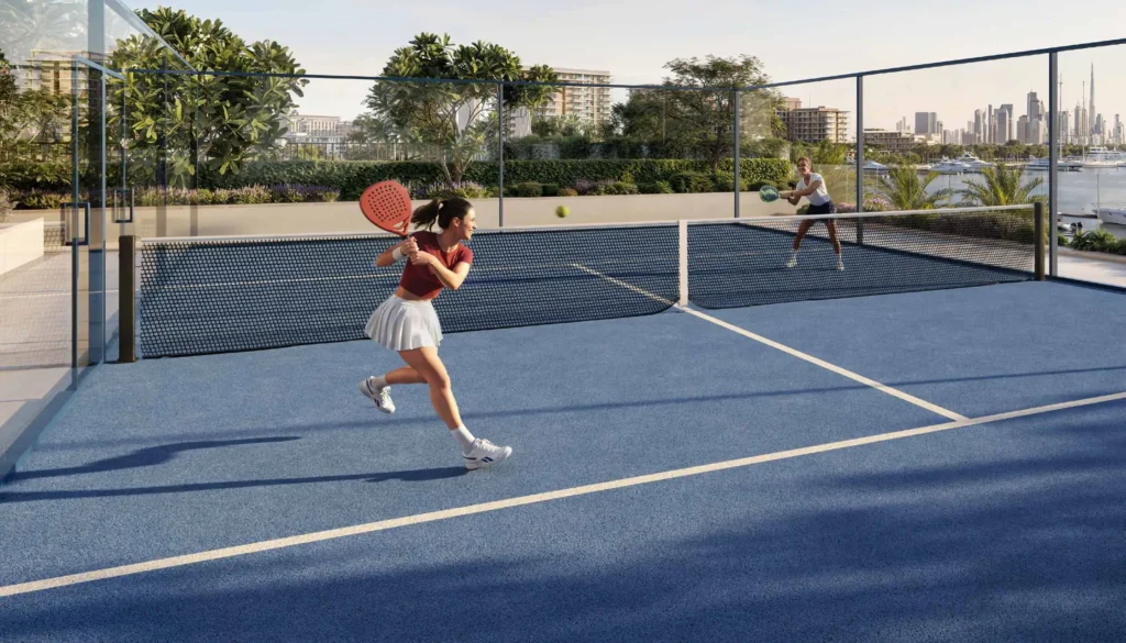 Residents benefit from a fully equipped gym, outdoor padel court, yoga area, BBQ spaces, event lawn, and dedicated children’s play areas designed for everyday recreation within the development.